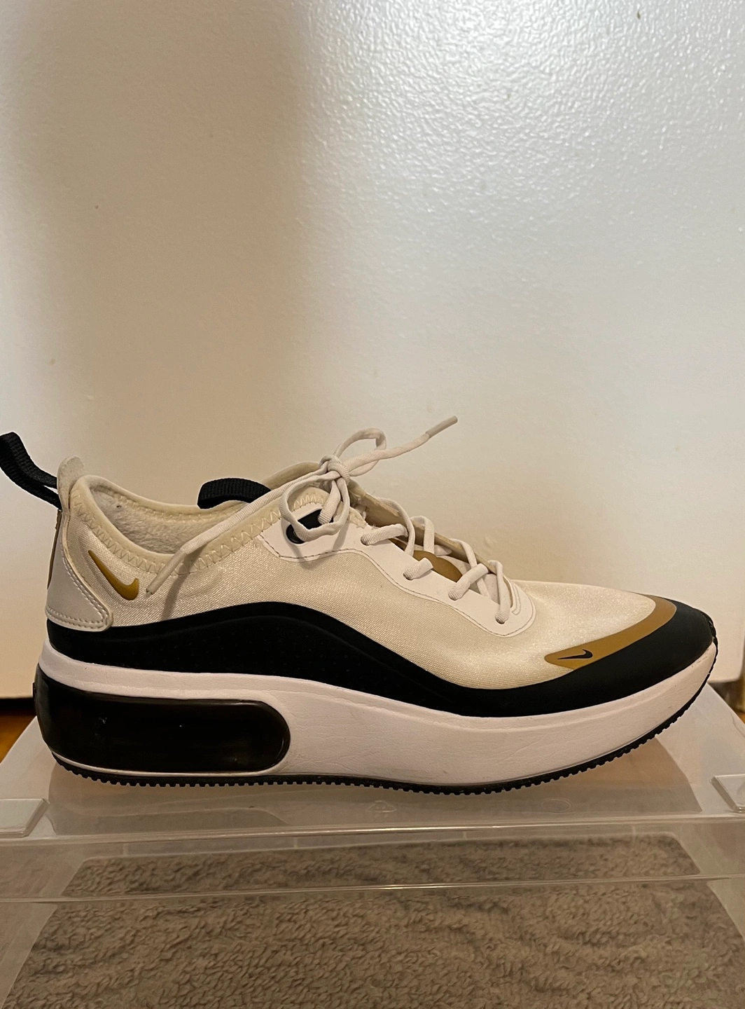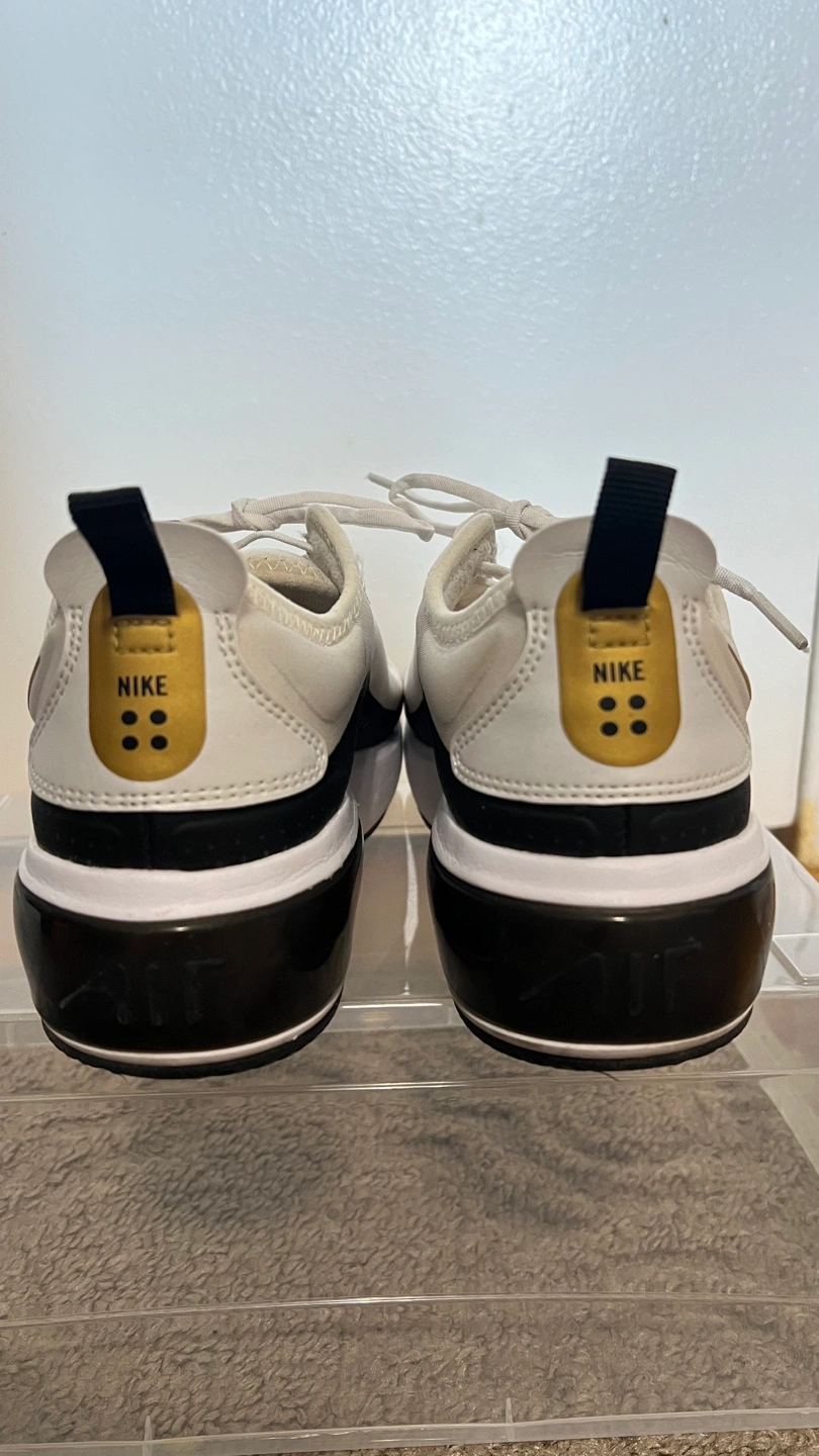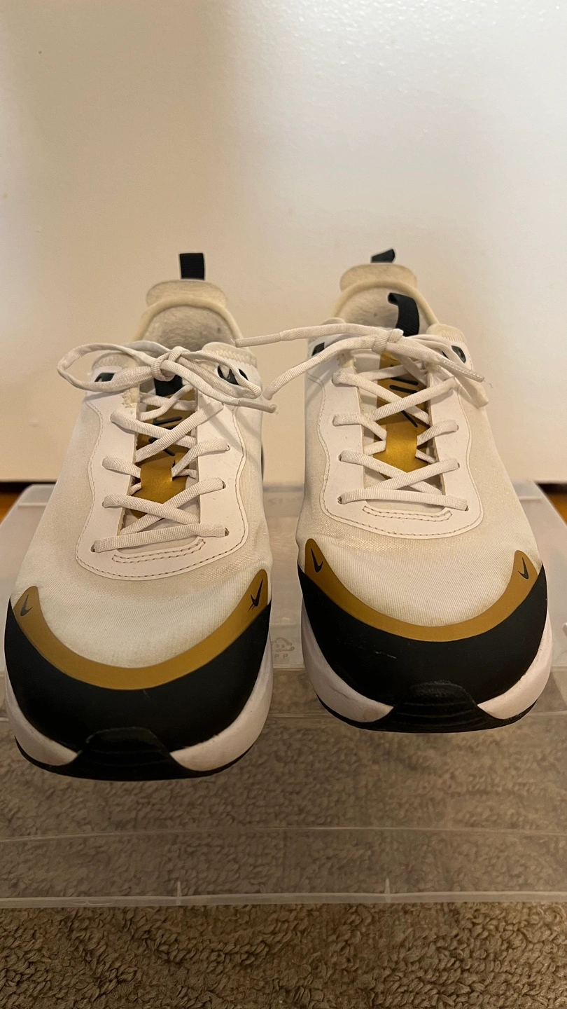 White and black sneakers with gold accents. Lace-up closure. Cushioned insole. Air Max technology.