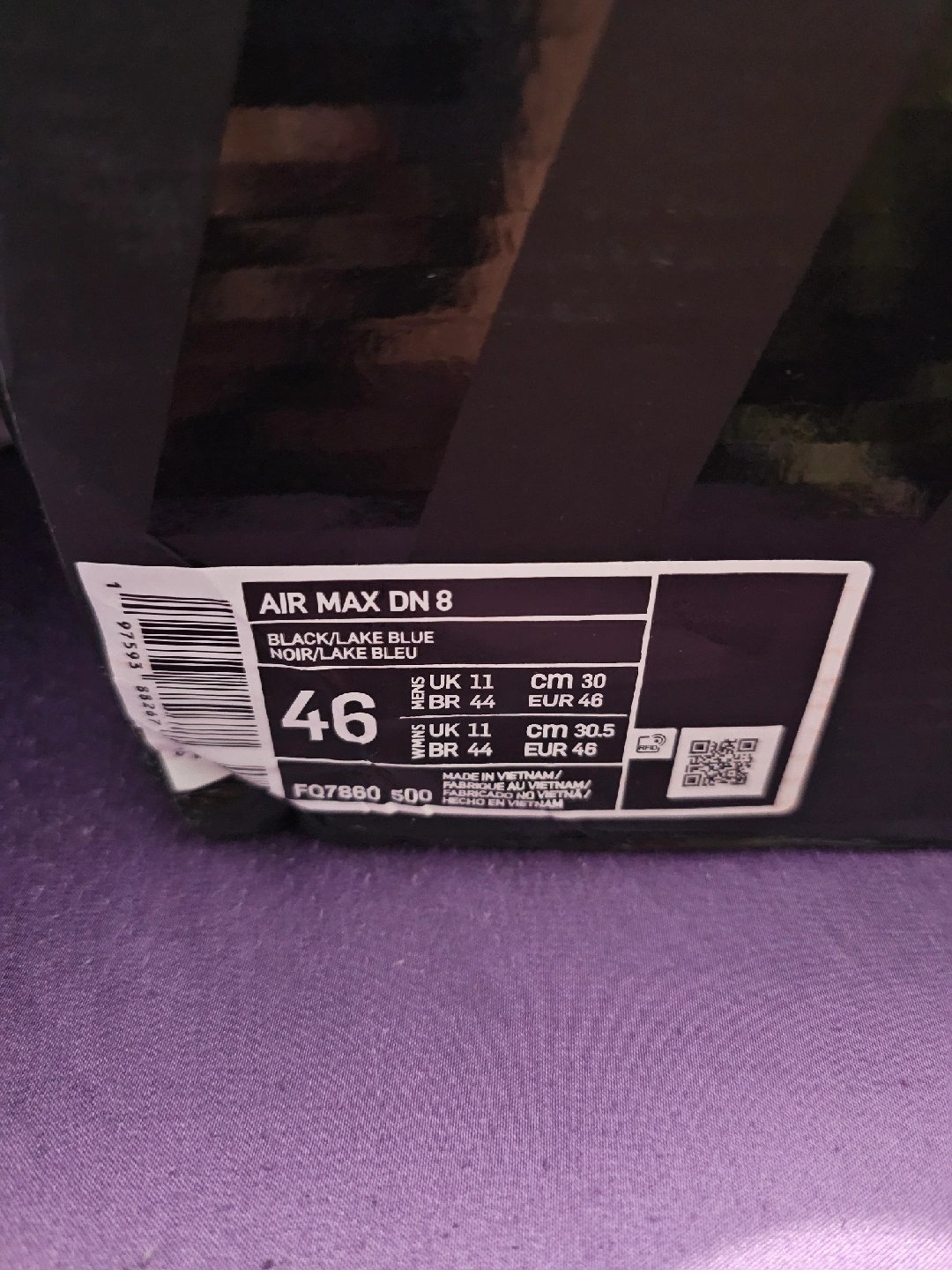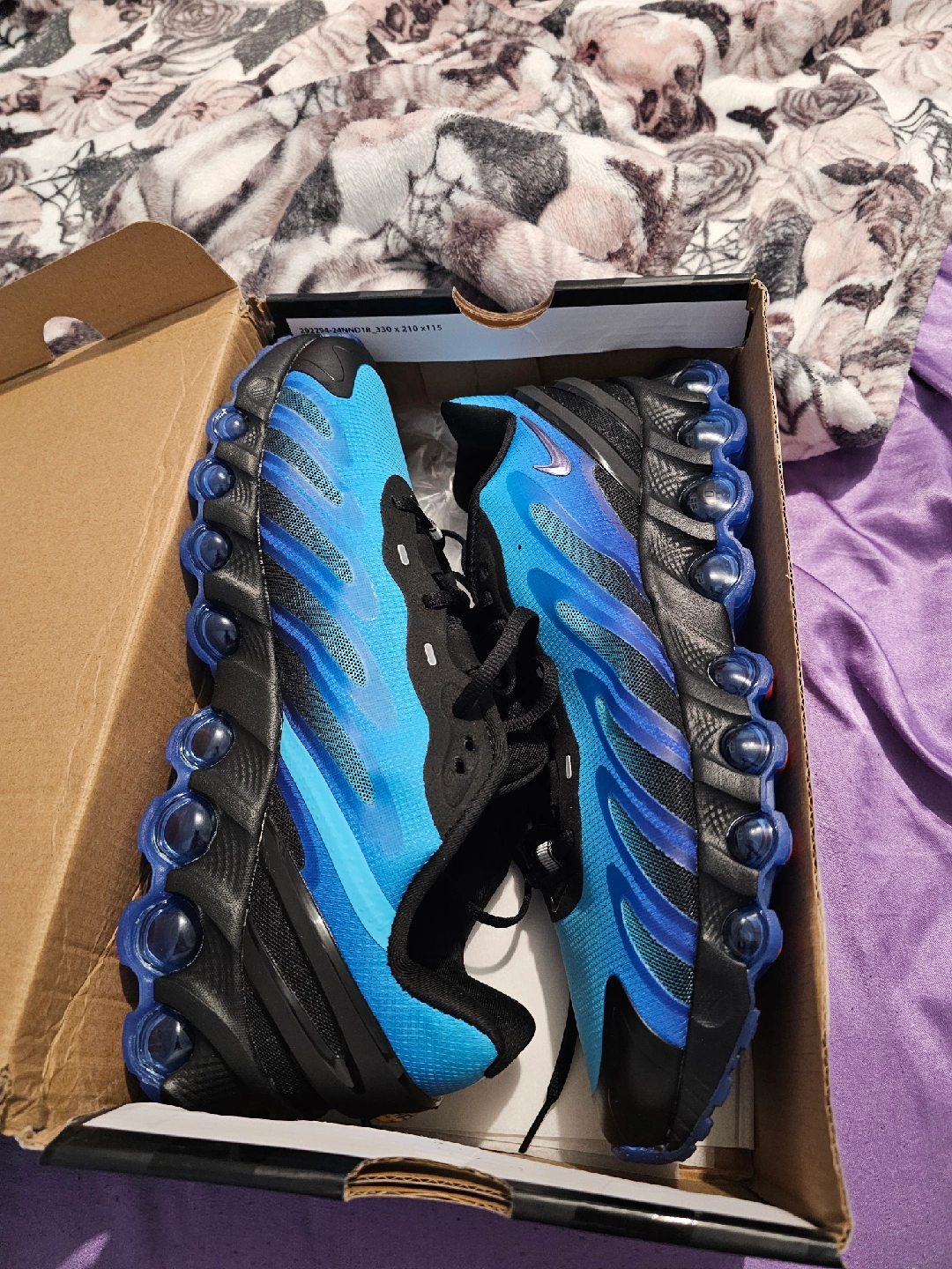 Selling a new pair of Nike Air Max DN 8 sneakers in black and blue. They come in the original box and are in great condition. Size 12 US men's. Bought it for my dad as a gift but doesn't fit him.