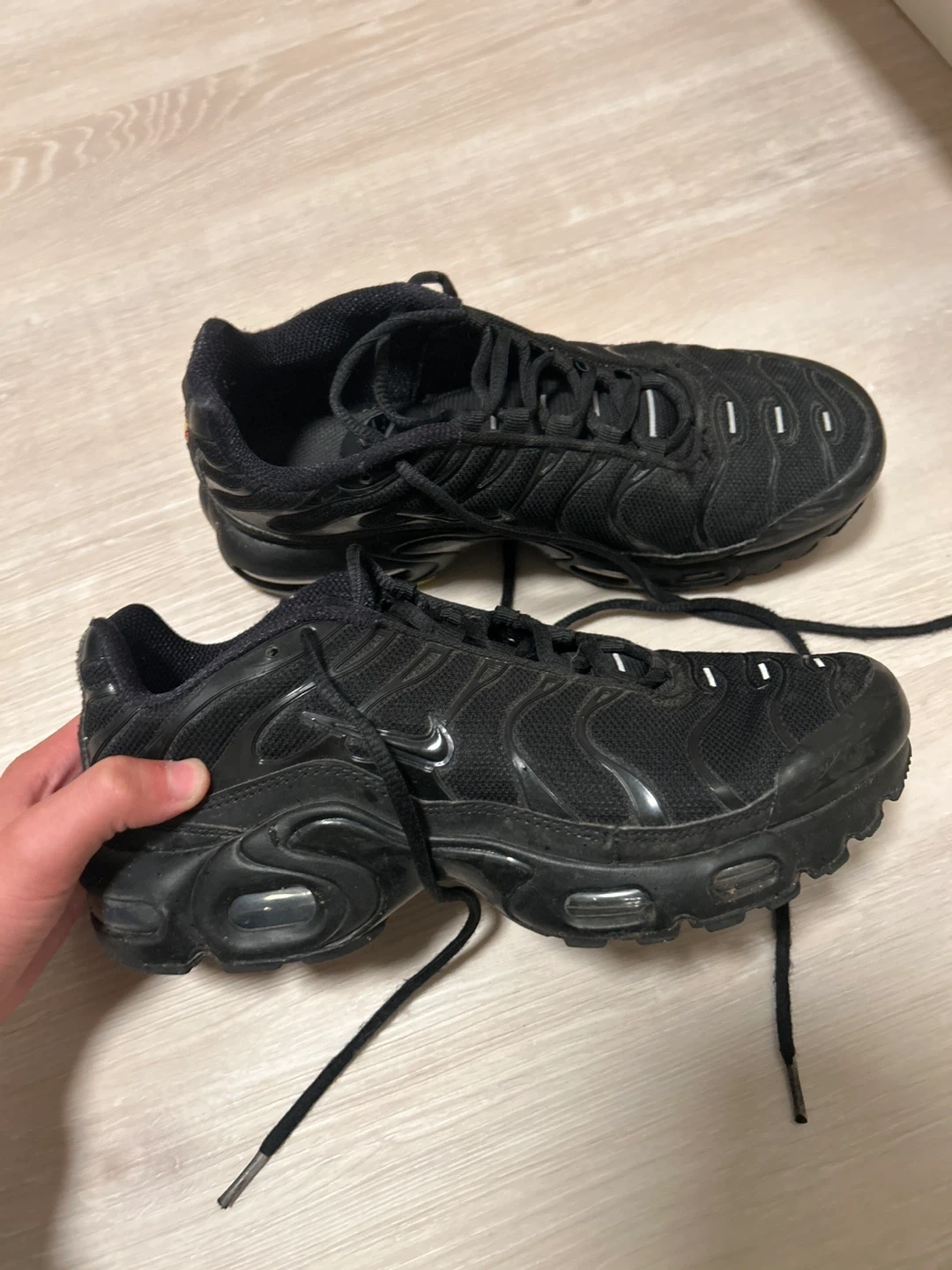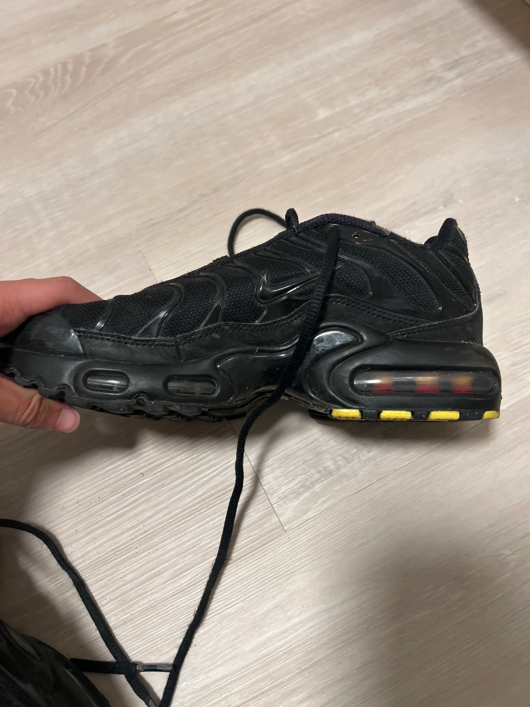 67Selling a pair of Nike Air Max Plus TN in black. They are size 6.5 youth. There are some signs of wear.