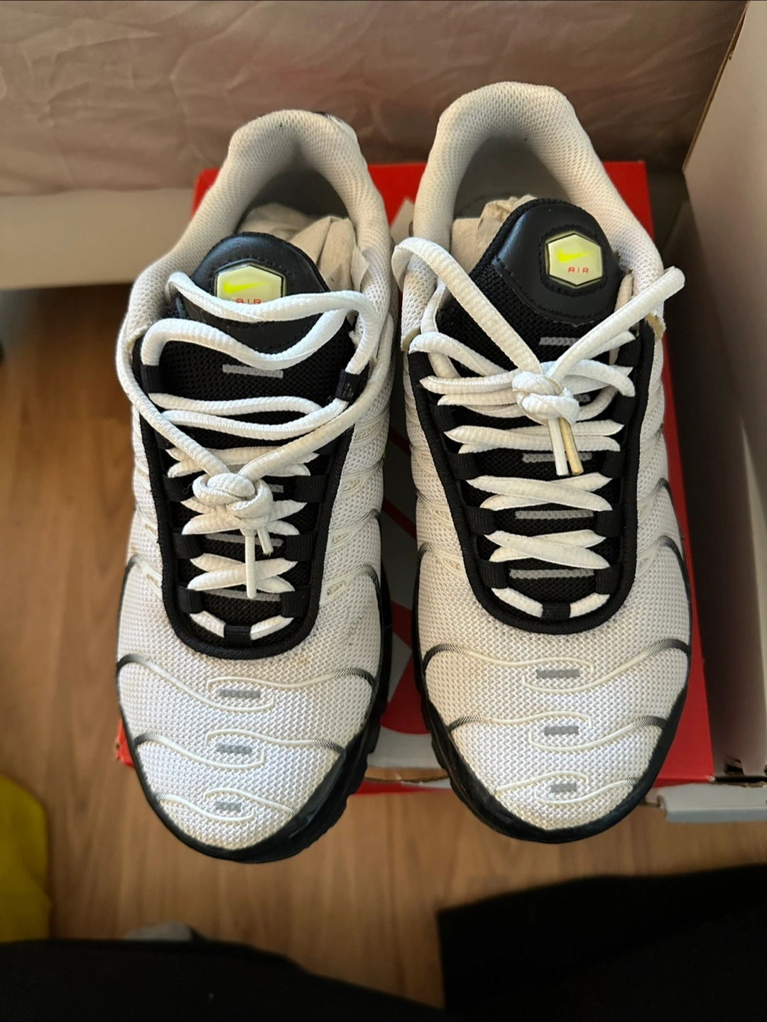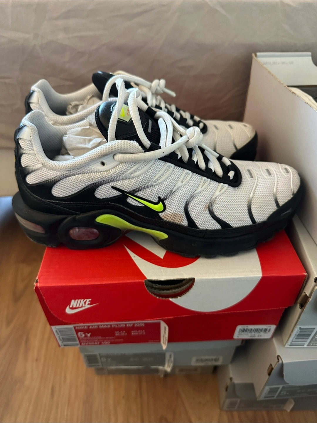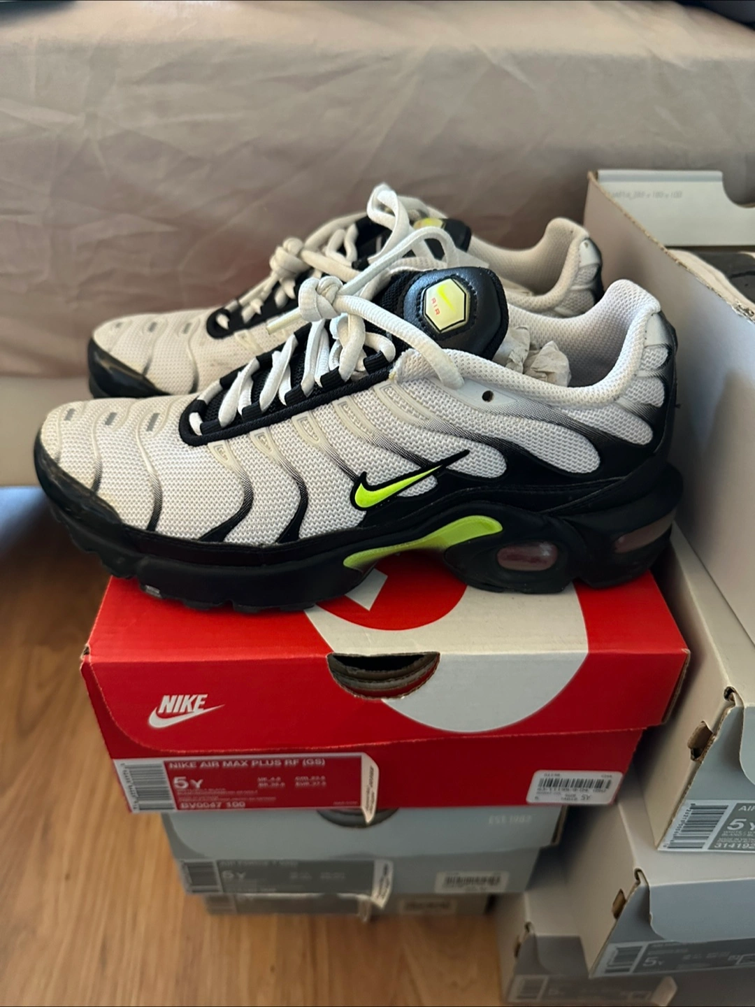 Kids' Nike Air Max Plus running shoes. White, black, and neon yellow accents. Size 5Y. In original box.