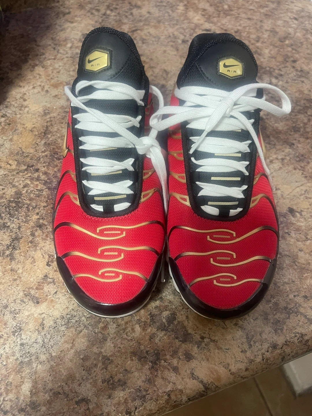 28Selling a pair of Nike Air Max Plus TN sneakers in red and gold. They are a US size 7.5. Great for adding a pop of colour to your outfit!