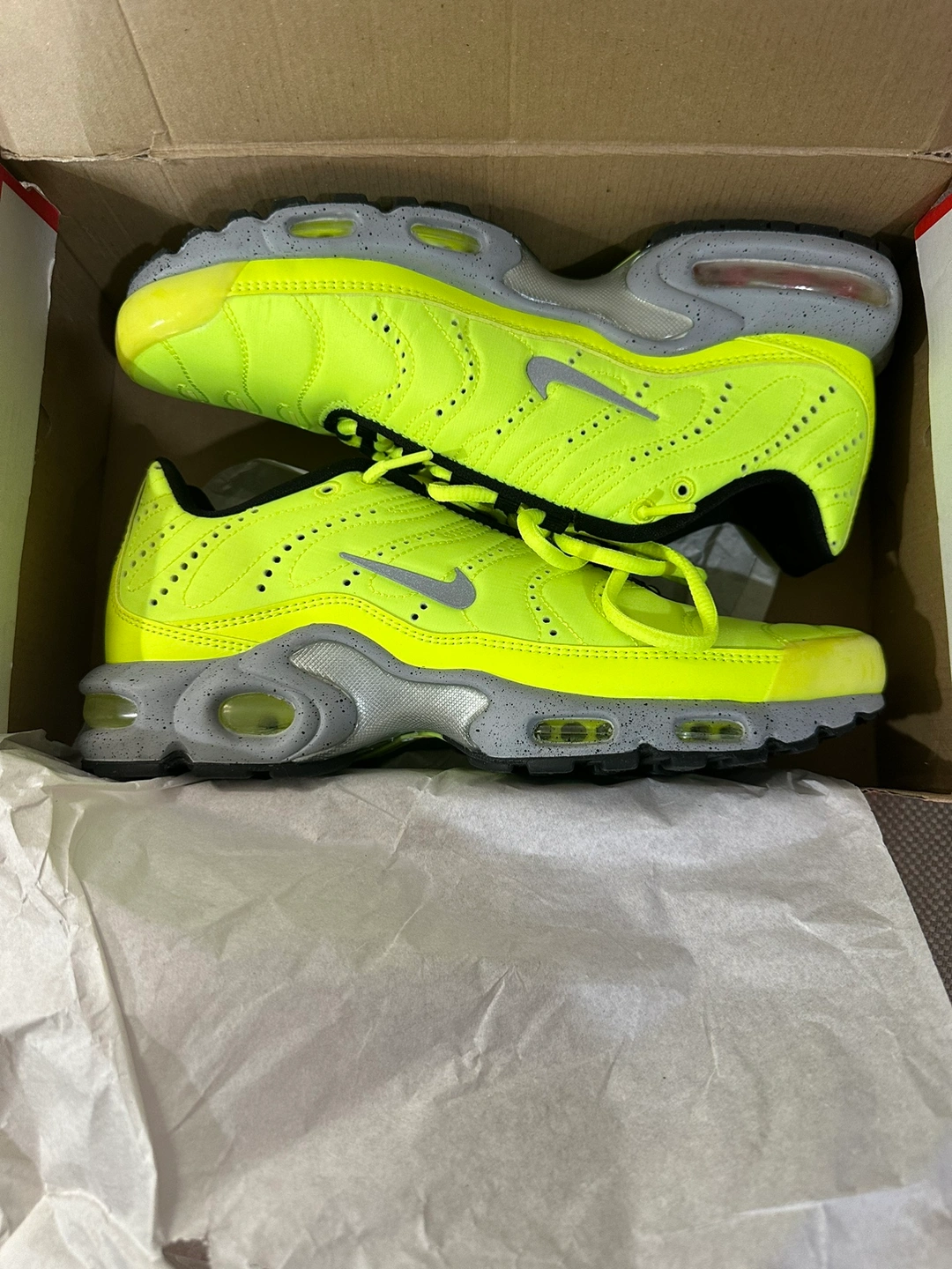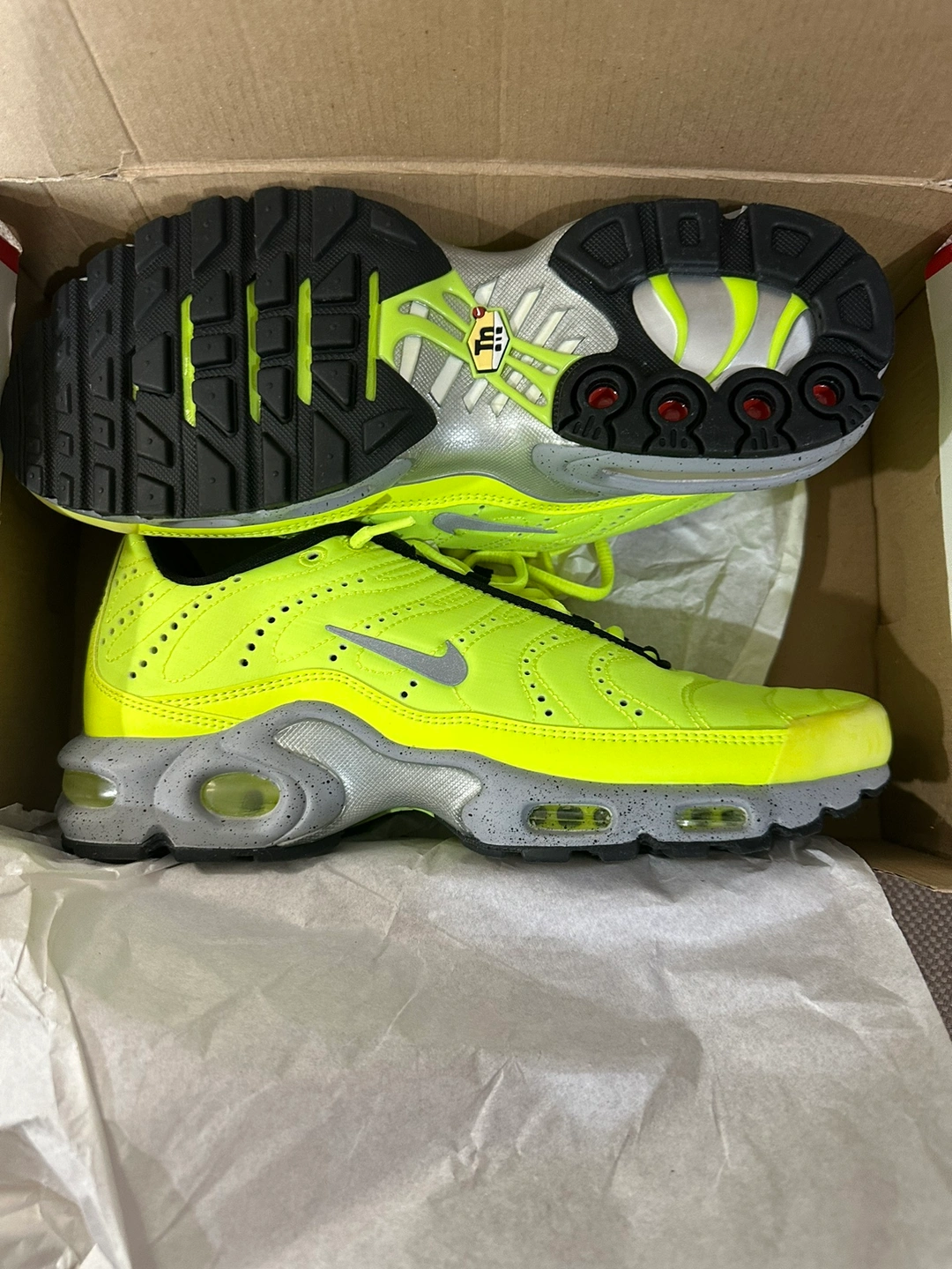 These are the iconic Nike Air Max Plus TN shoes. They feature a bright yellow colour with black and silver accents.