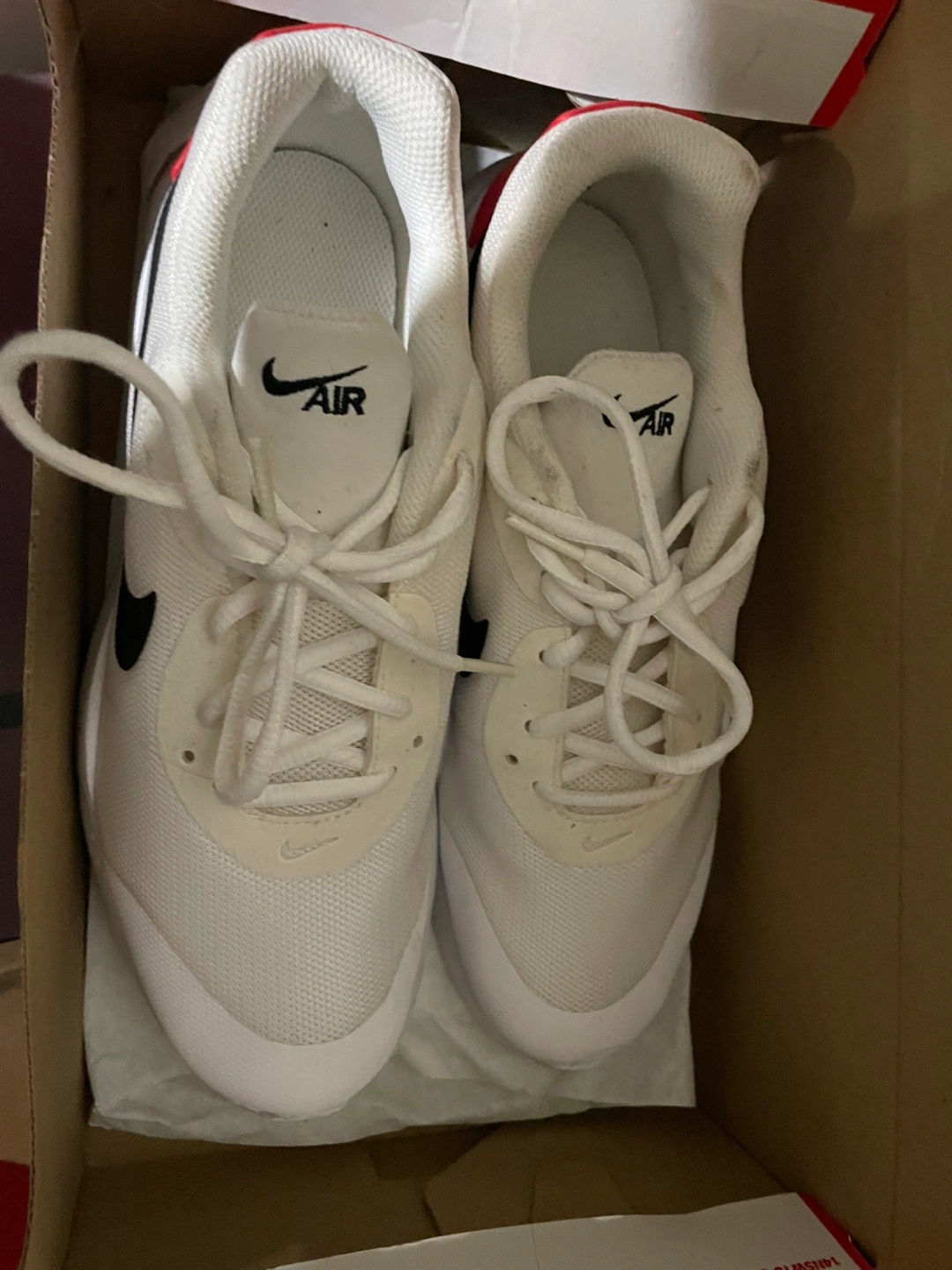 70Pair of white Nike Air Max SC sneakers. White upper, black accents, red detailing. Lightly used, good condition.
