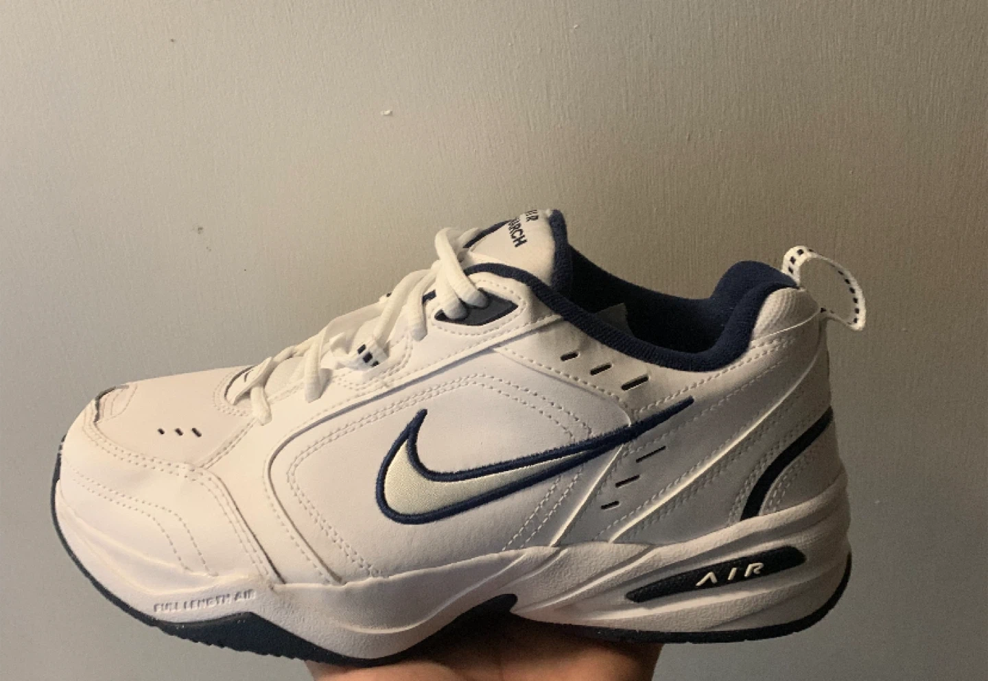 Selling a pair of Nike Air Monarch IV sneakers in white with navy accents! These are in great shape and ready for a new home. Classic style and comfort! Mens 8
