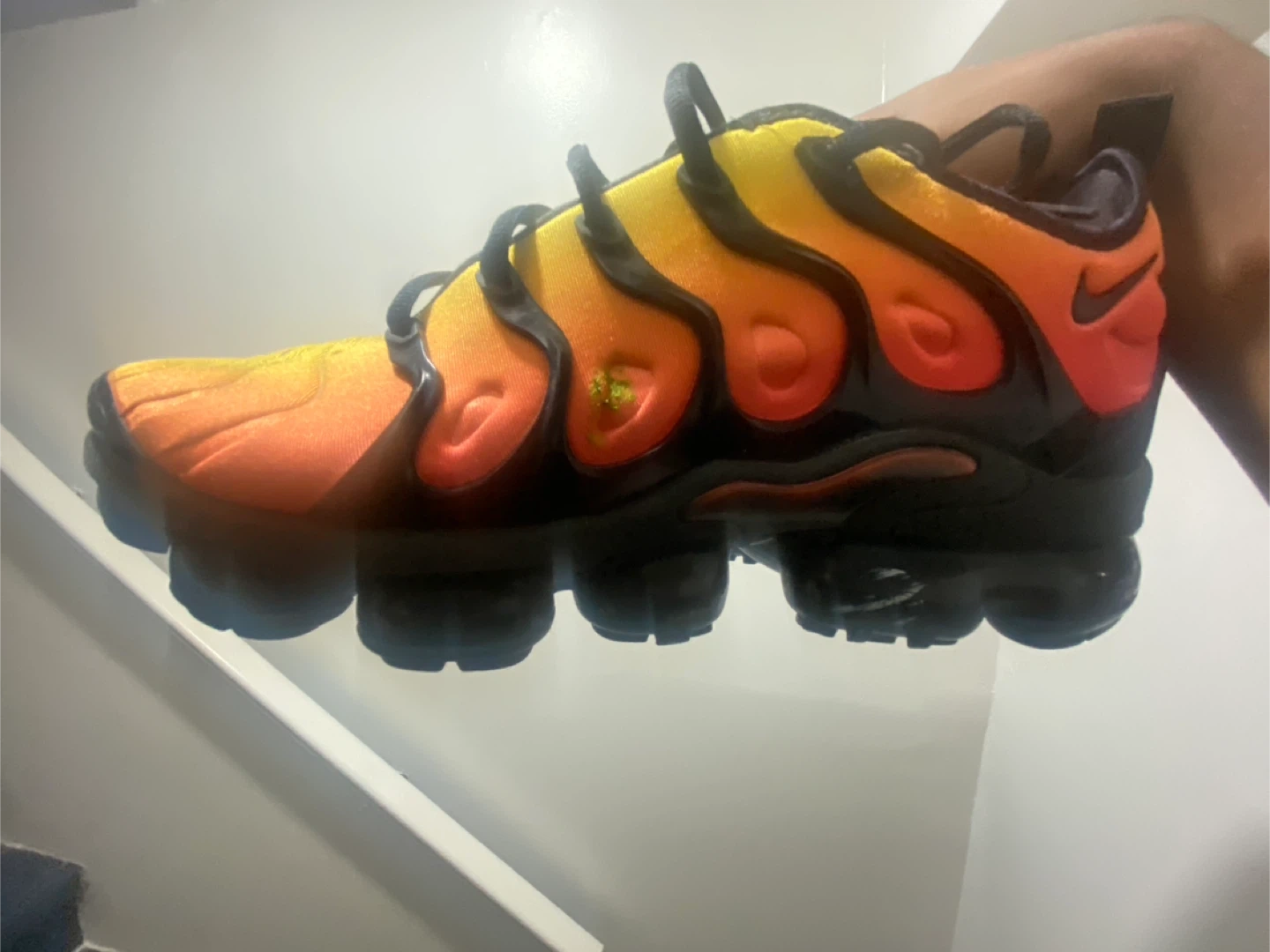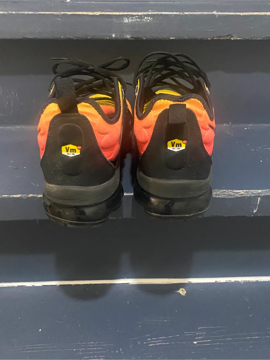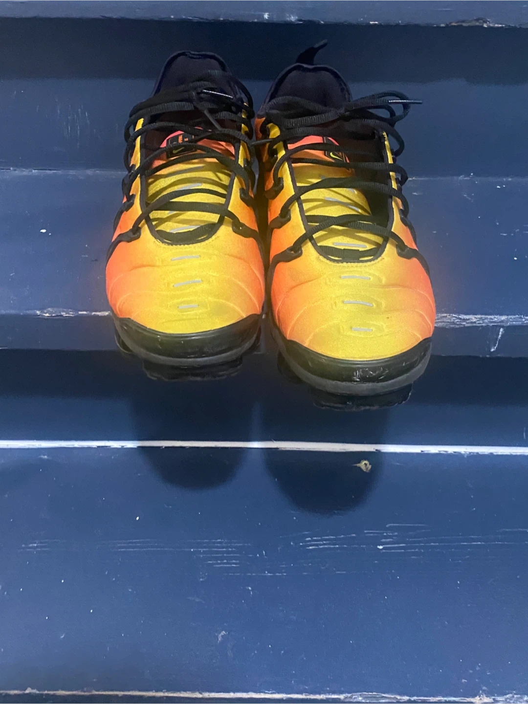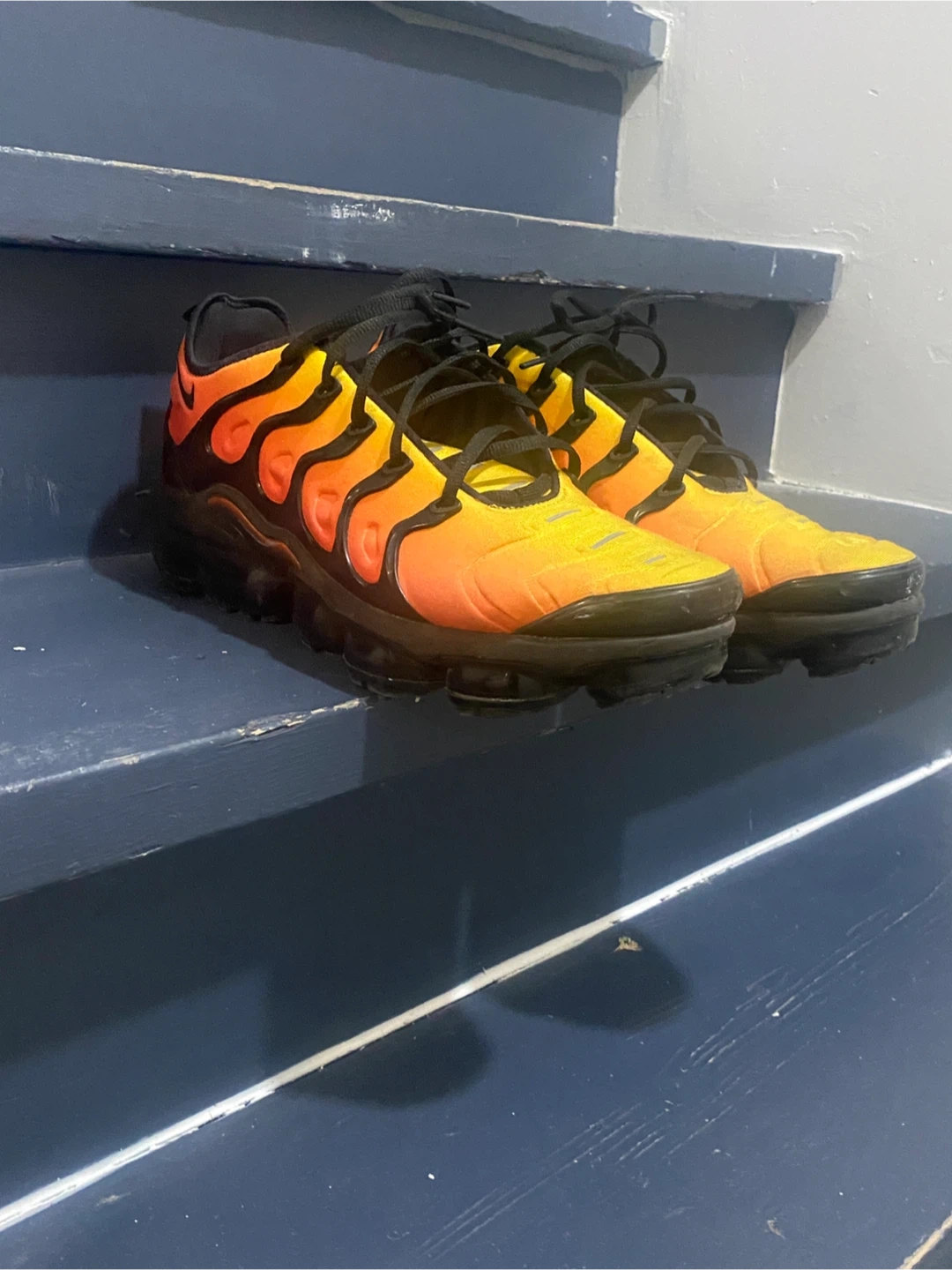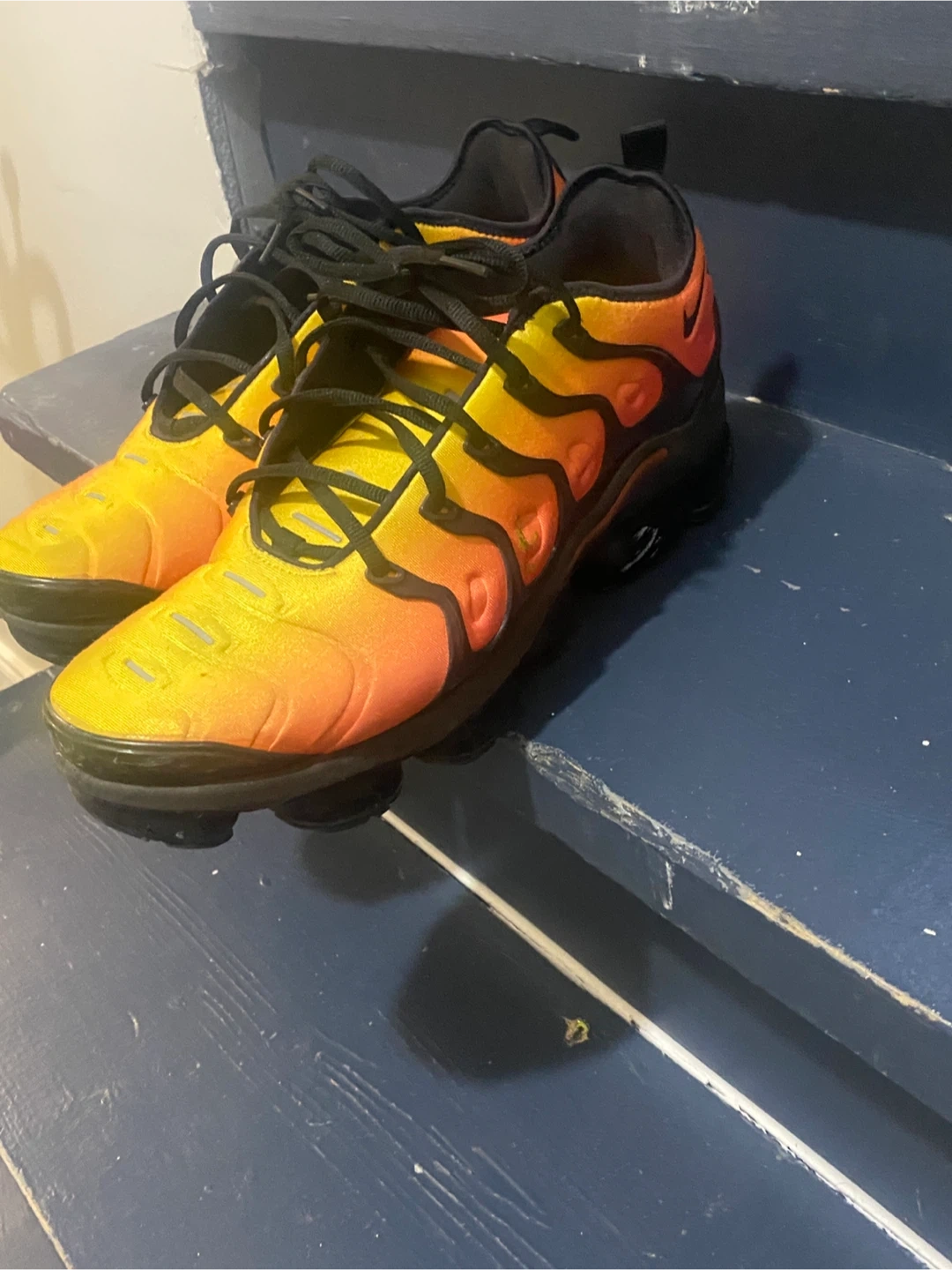 Selling a pair of Nike Air VaporMax Plus sneakers in a vibrant yellow and orange gradient. They are in great condition and feature the signature VaporMax sole for ultimate comfort and style. The size is us 11 and uk 12 but they're a stylish addition to any wardrobe!