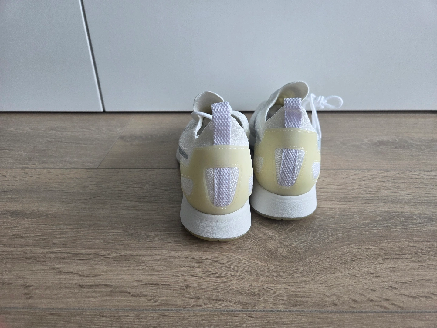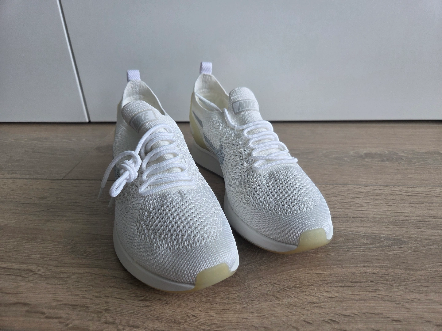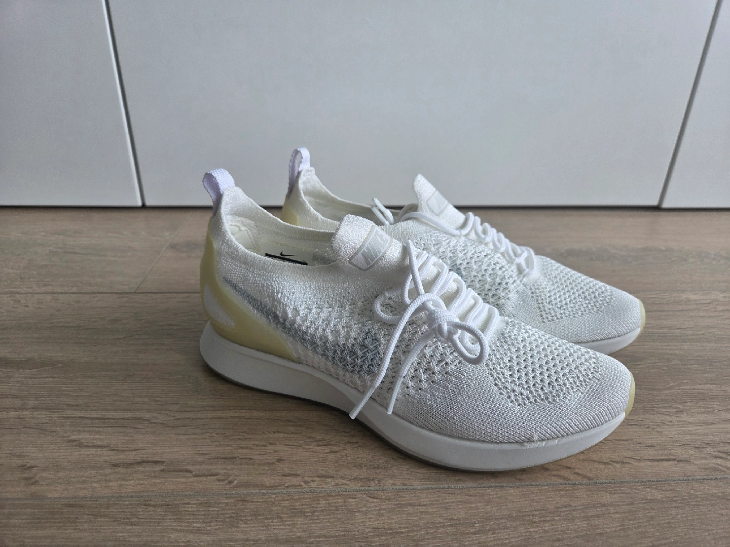 Selling a pair of Nike Air Zoom Mariah Flyknit Racer sneakers in white! These are super lightweight and comfortable, perfect for everyday wear. The Flyknit material makes them breathable, and the Zoom Air cushioning provides great support.