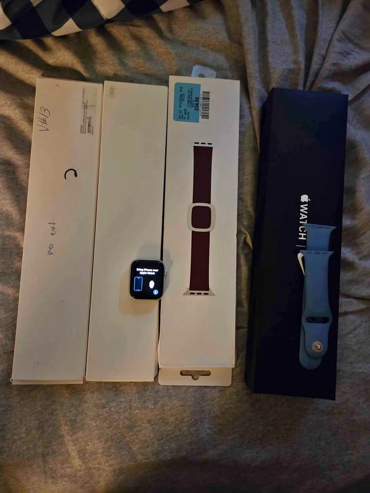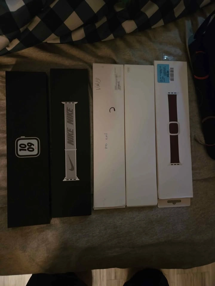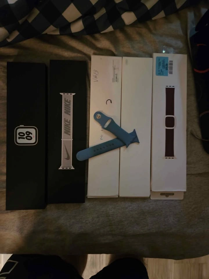 Nike se apple watch comes with original box and all the straps shows and in the boxes. Does not have the original nike watch band. Comes with the charging cords in box.