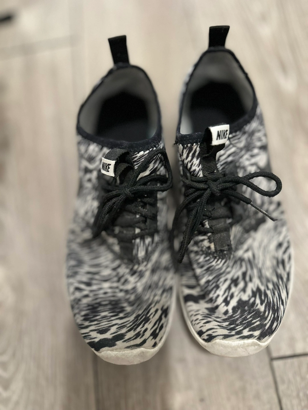 86Pair of patterned shoes. They feature black laces and a white sole.