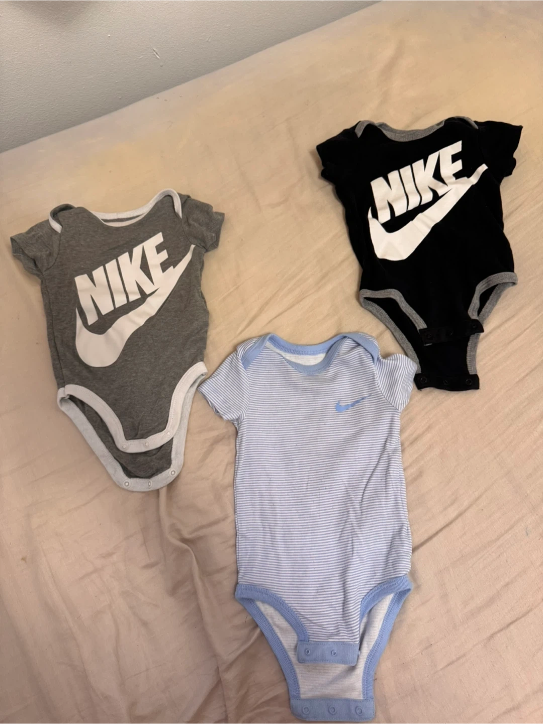 76Selling a set of three adorable Nike baby onesies! You'll get a black one with a large white Nike logo, a grey one, also with a large white Nike logo, and a blue and white striped one with a small blue Nike logo. Great for your little one! $5 each