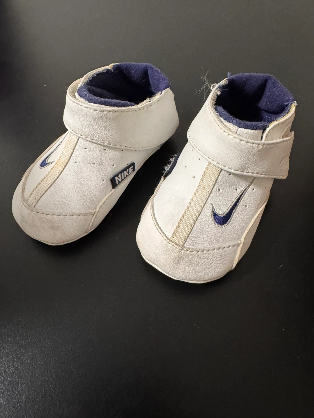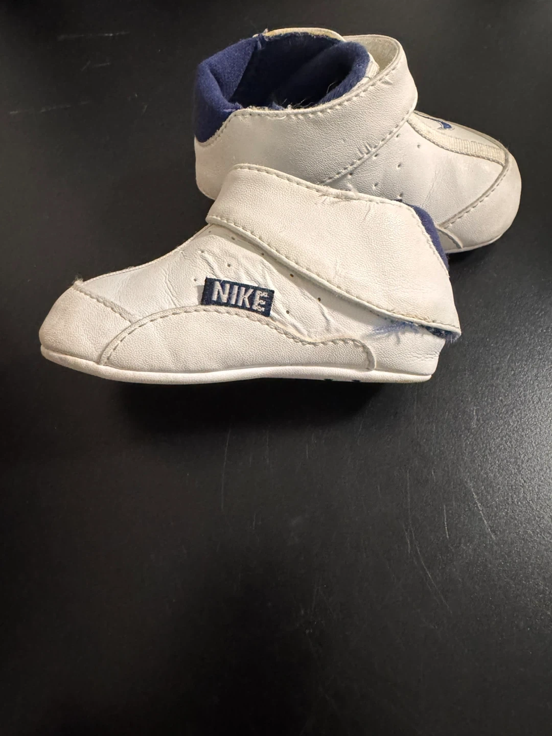 61These adorable Nike baby shoes are perfect for your little one! They are white with a blue Nike logo and have a convenient velcro strap. They are in good used condition and ready for a new home!
