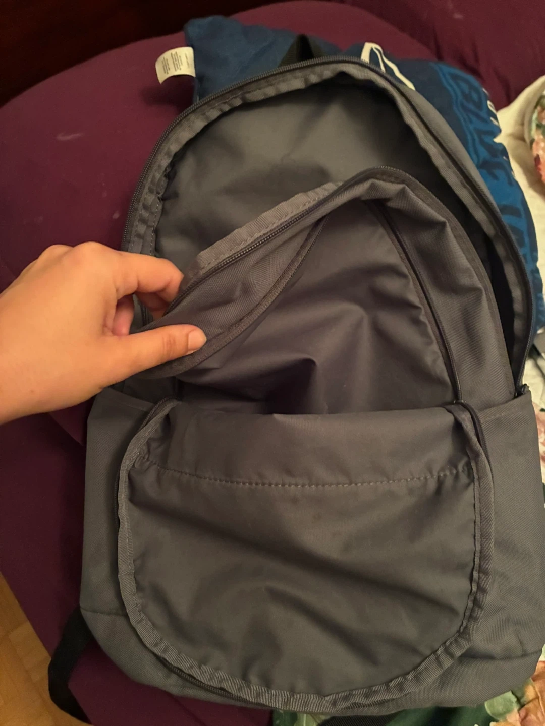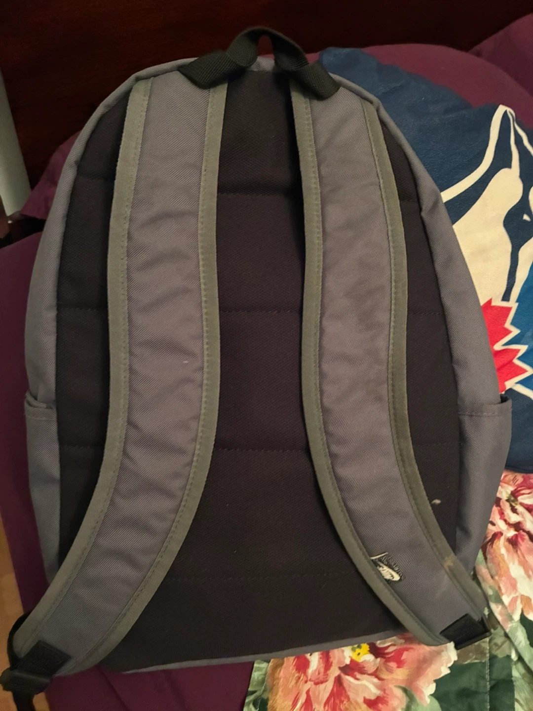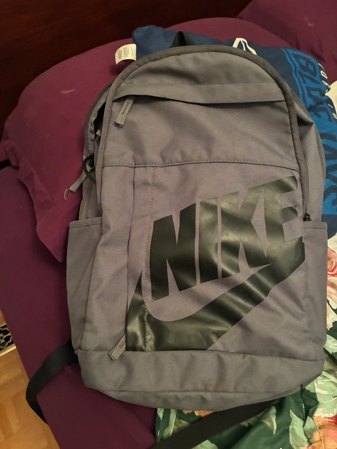 Selling a grey Nike backpack. It has a large Nike logo on the front. It has a main compartment and a smaller front pocket, plus two side pockets. The straps are adjustable for a comfortable fit