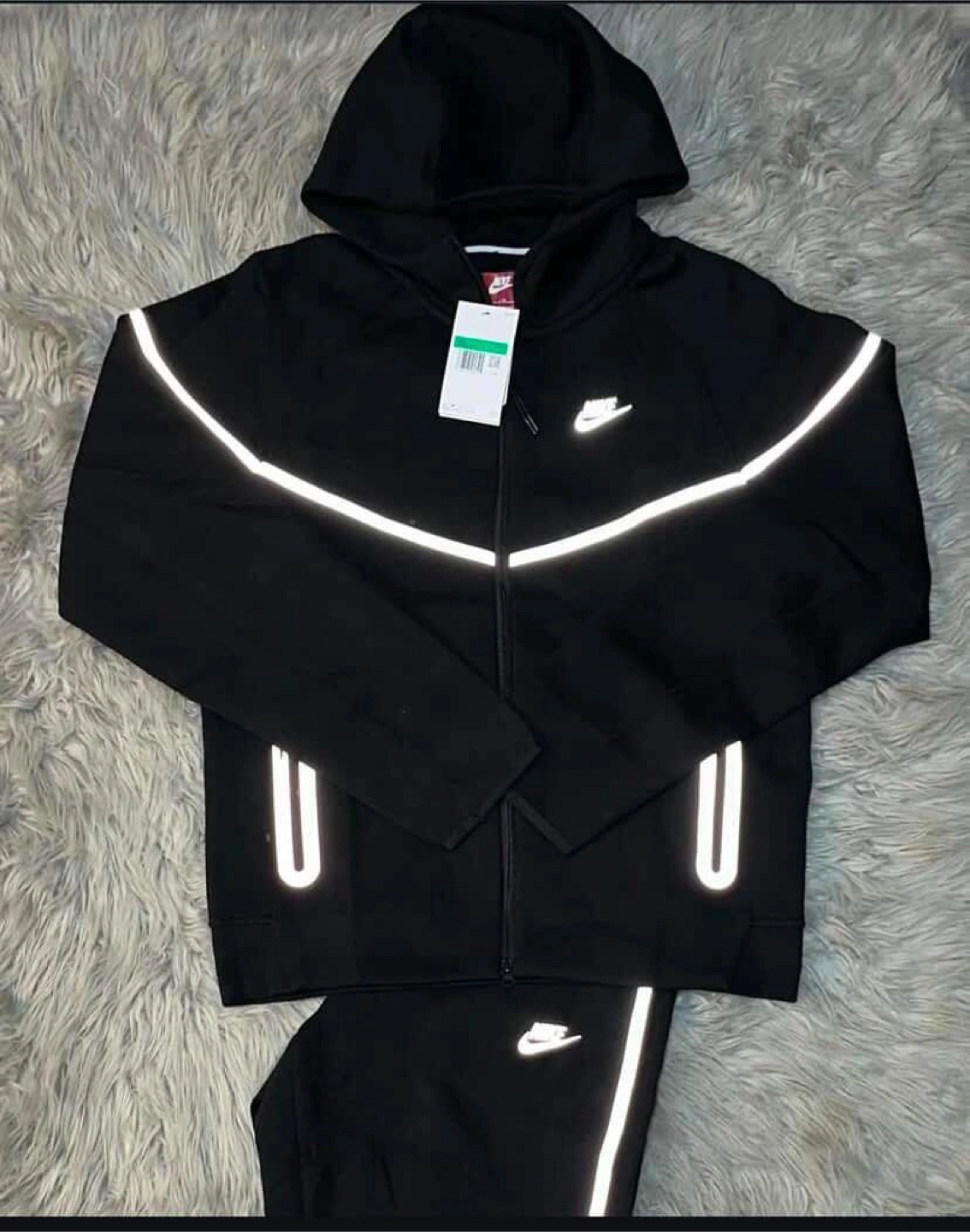 Selling a Nike tracksuit in black. It features a hoodie and pants, perfect for workouts or casual wear. The tracksuit has reflective detailing for added visibility. It's in great condition and ready for a new home