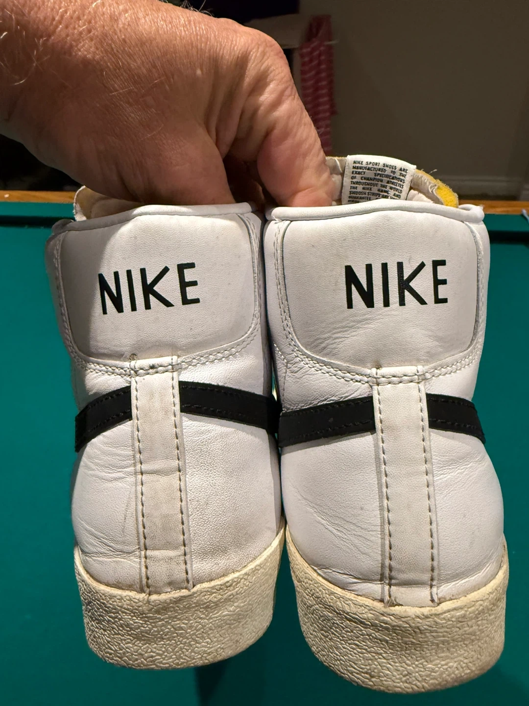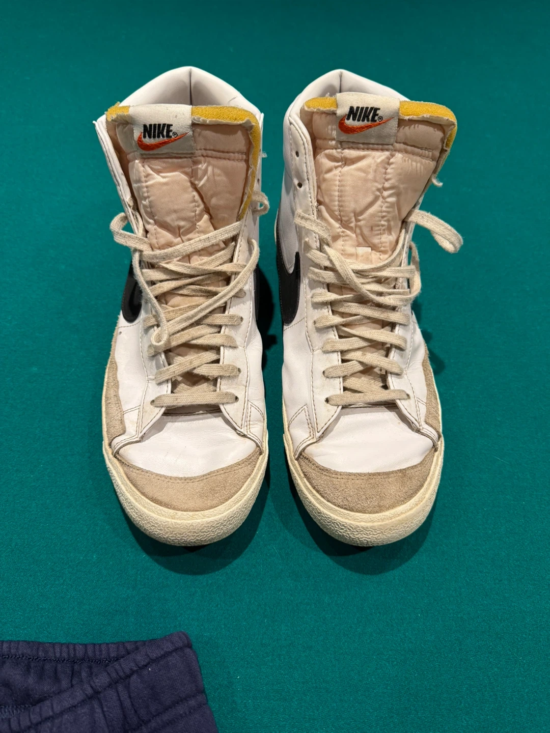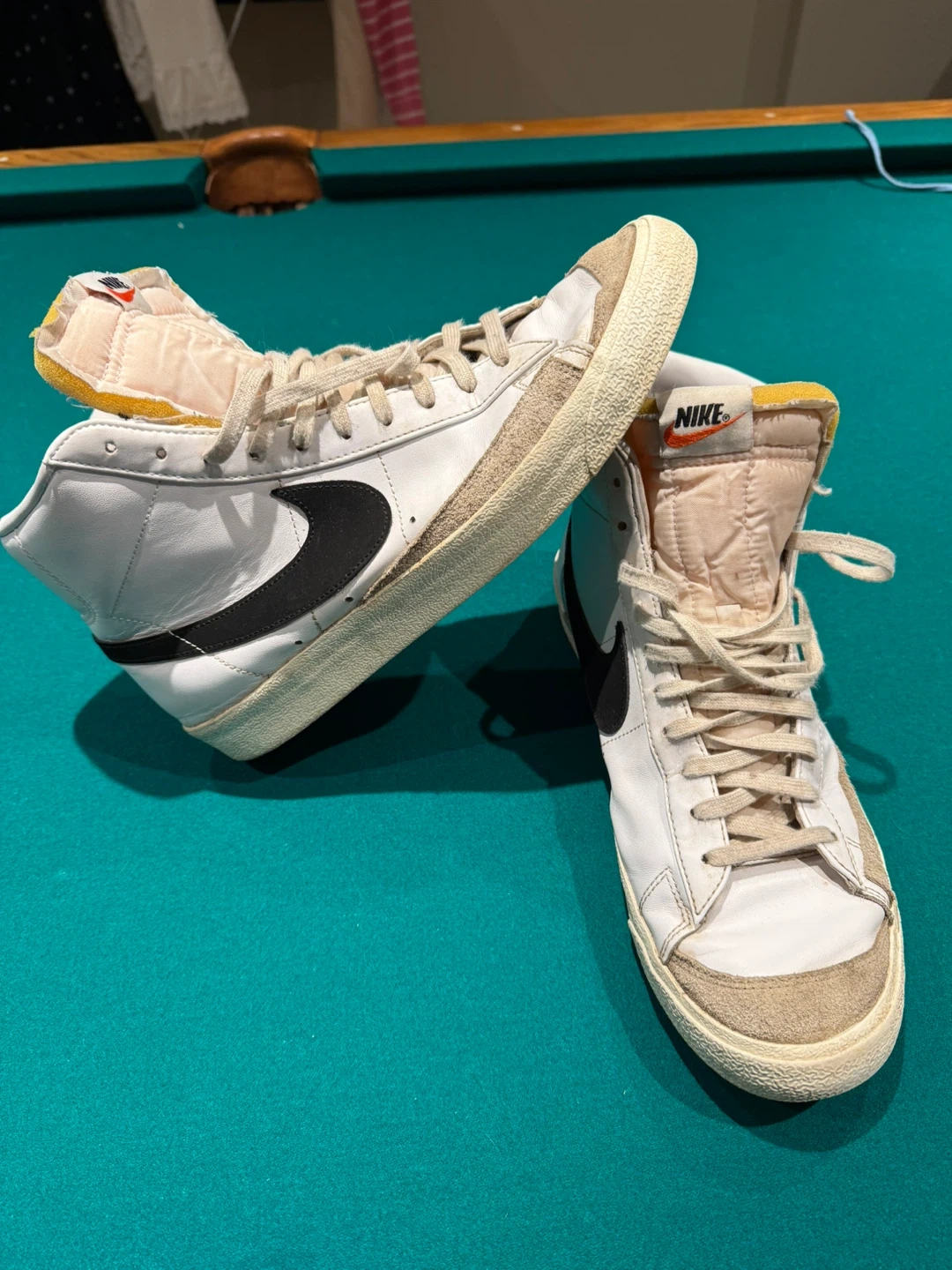 Selling a pair of Nike Blazer high-top sneakers. 13 US They're white with a black swoosh some signs of wear, but still have lots of life left. Great for casual wear or hitting the court! Too many pairs clearing out.