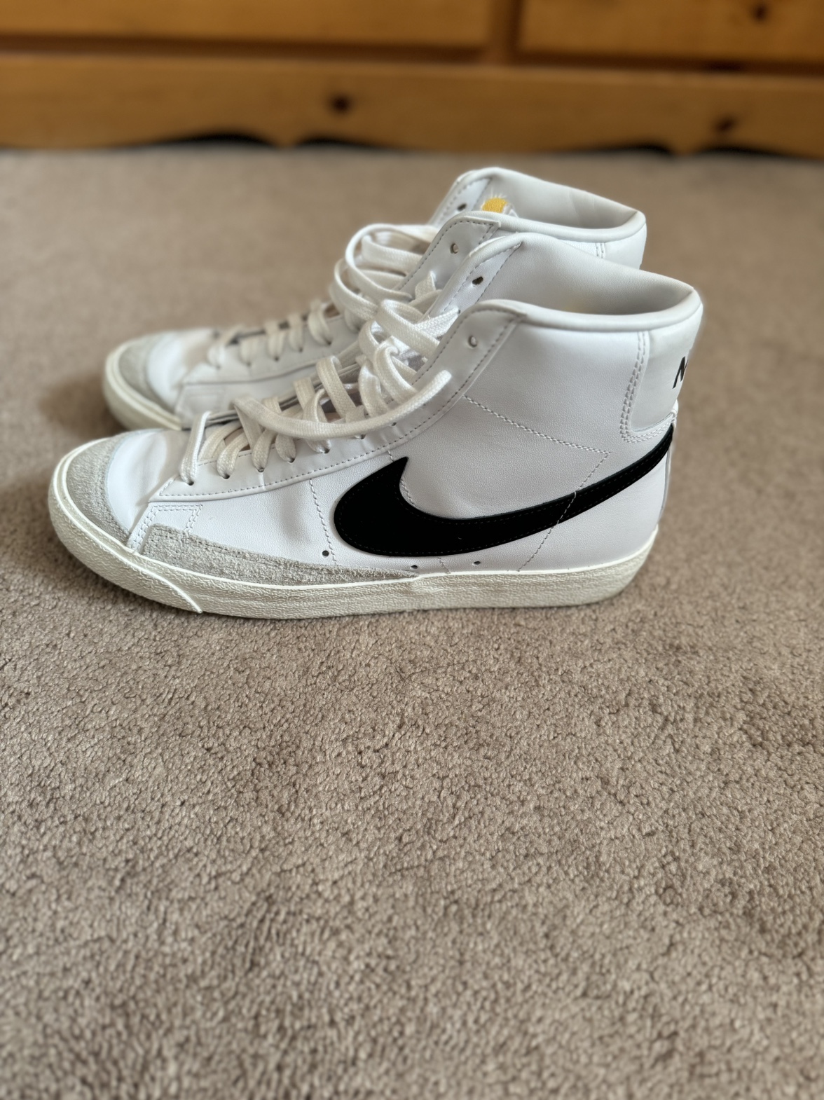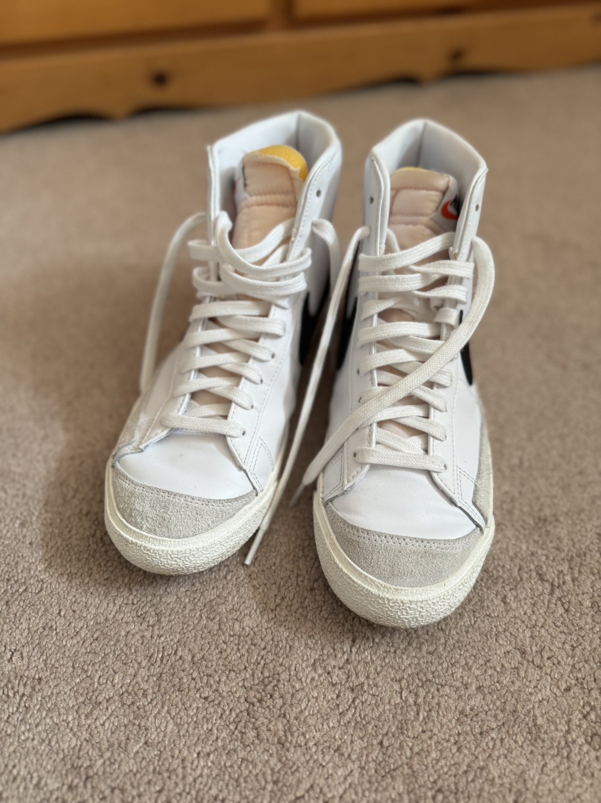 These sneakers are in a classic white and black colourway. They are a high-top style and have a vintage look. They are a great addition to any wardrobe.