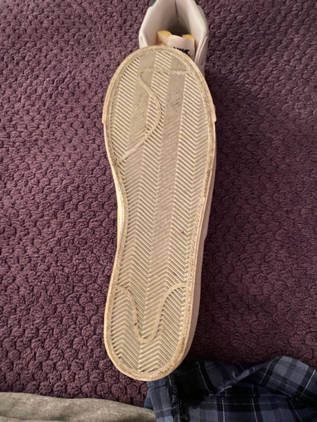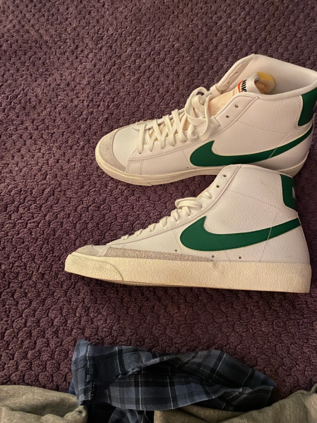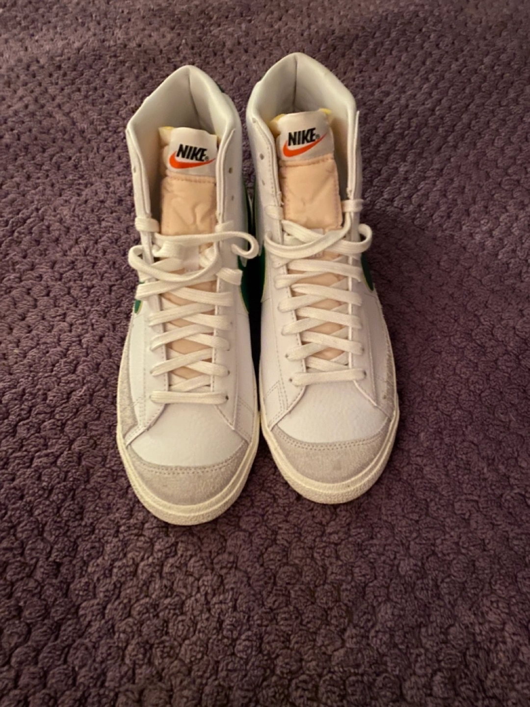 White leather high-top sneakers. Green swoosh logo. Cream midsole. Pre-owned condition.