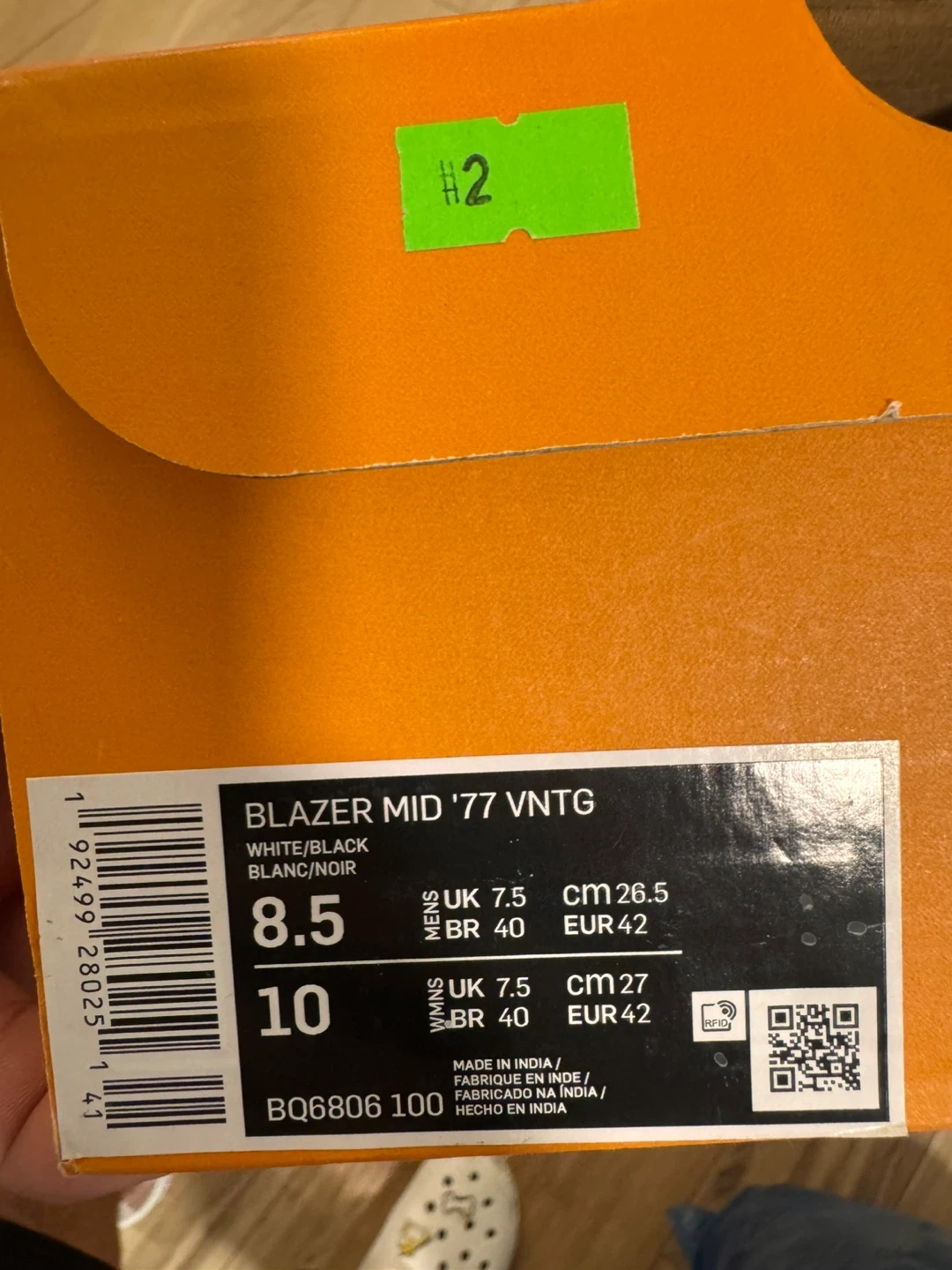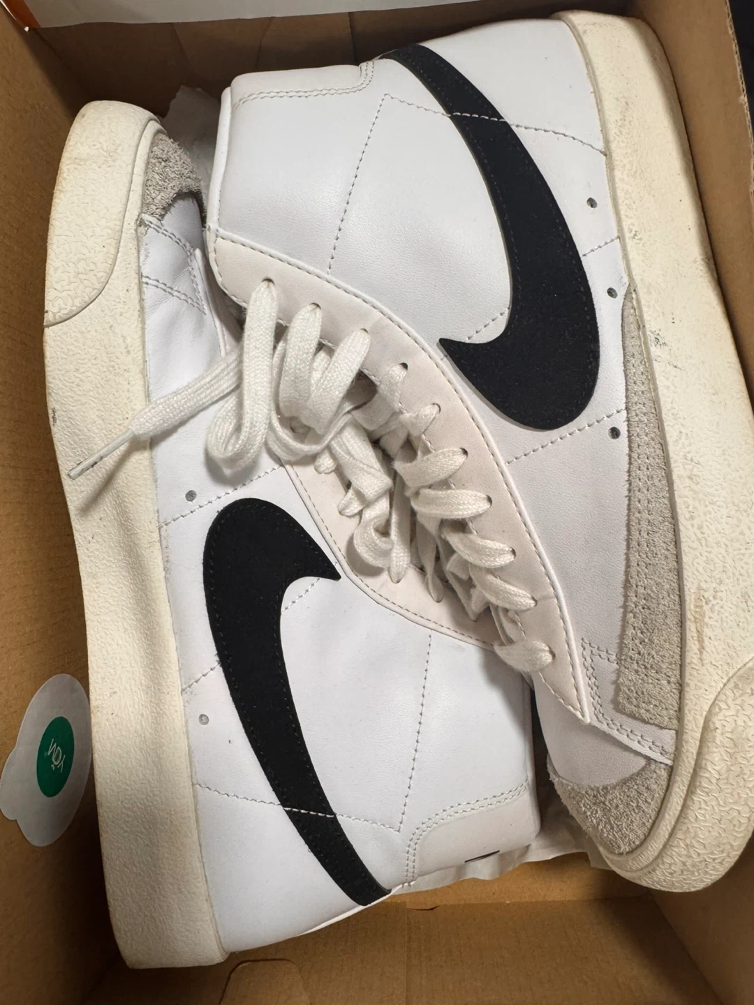 Selling a pair of Nike Blazer Mid '77 VNTG sneakers in white and black. They are in great condition and come with the original box. The size is 8.5 US men's.