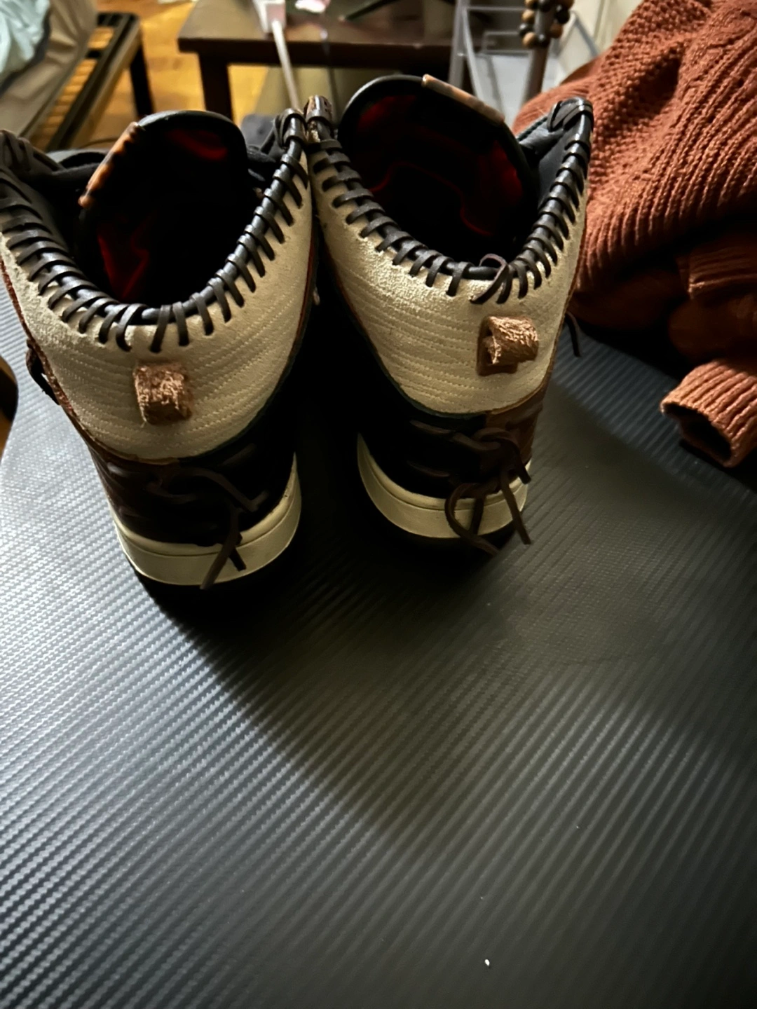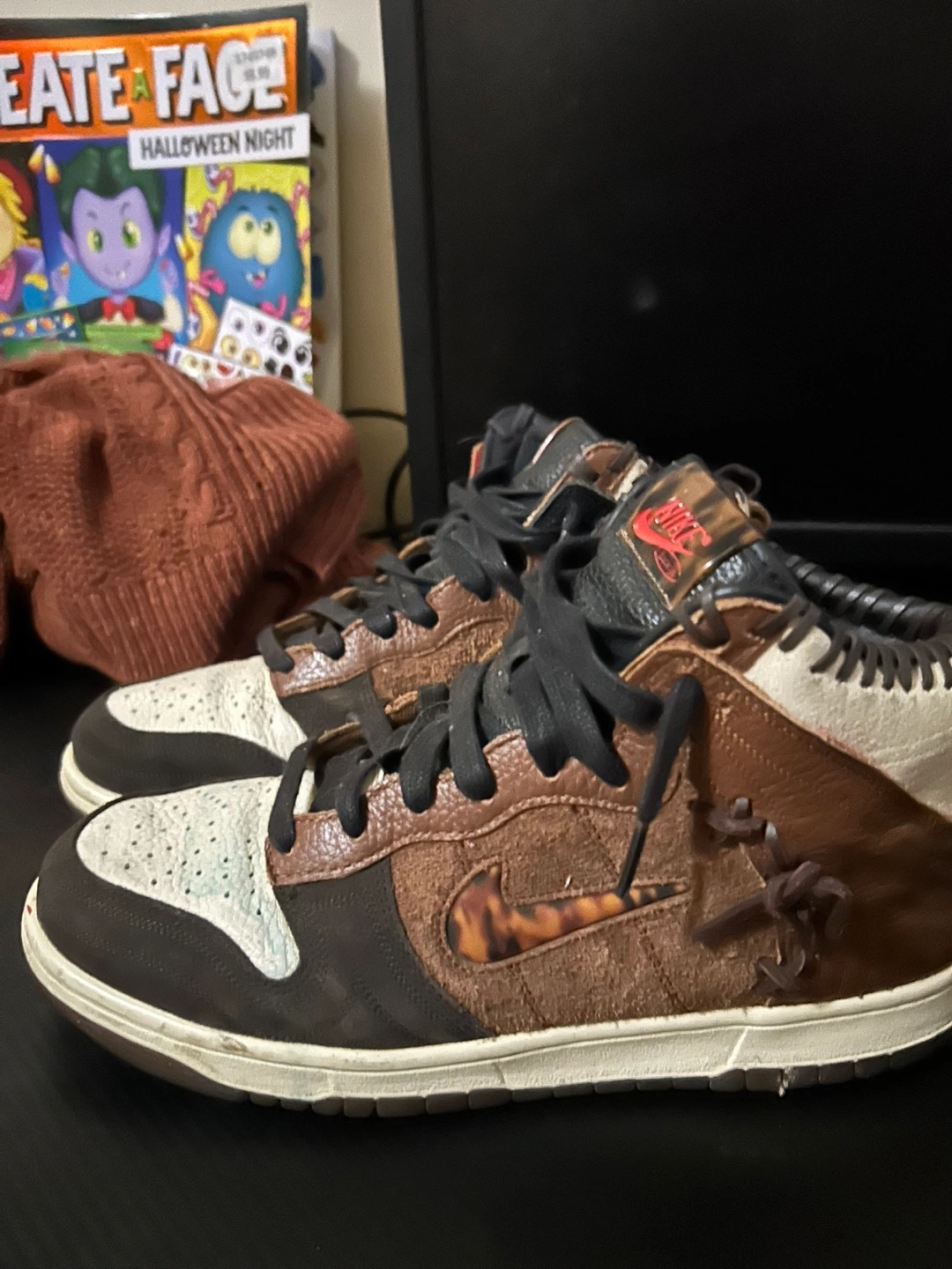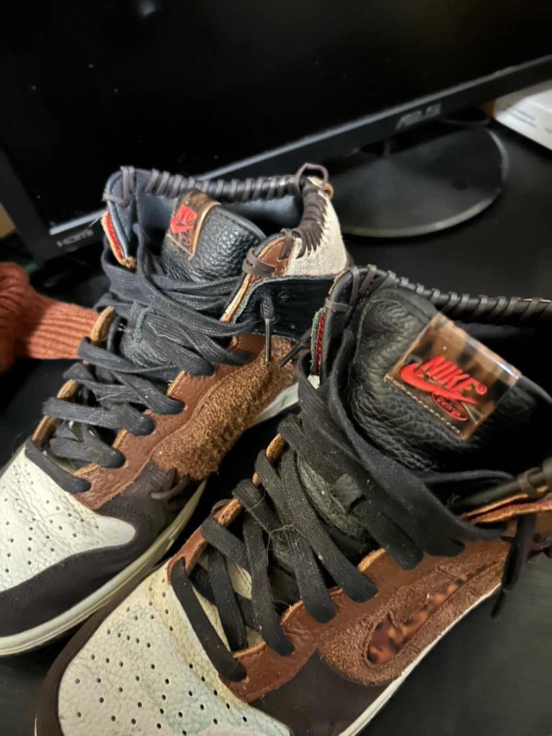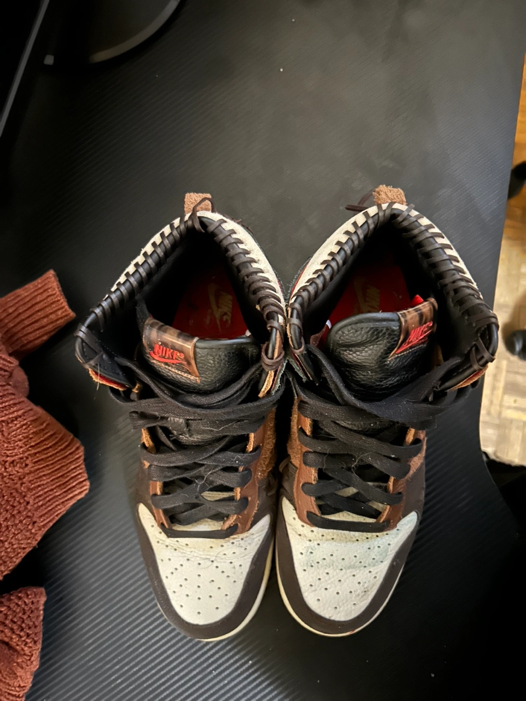 Selling a pair of Nike Dunk High Premium sneakers. They feature a unique brown and white colourway with black laces. The shoes show some signs of wear but are still in good condition.