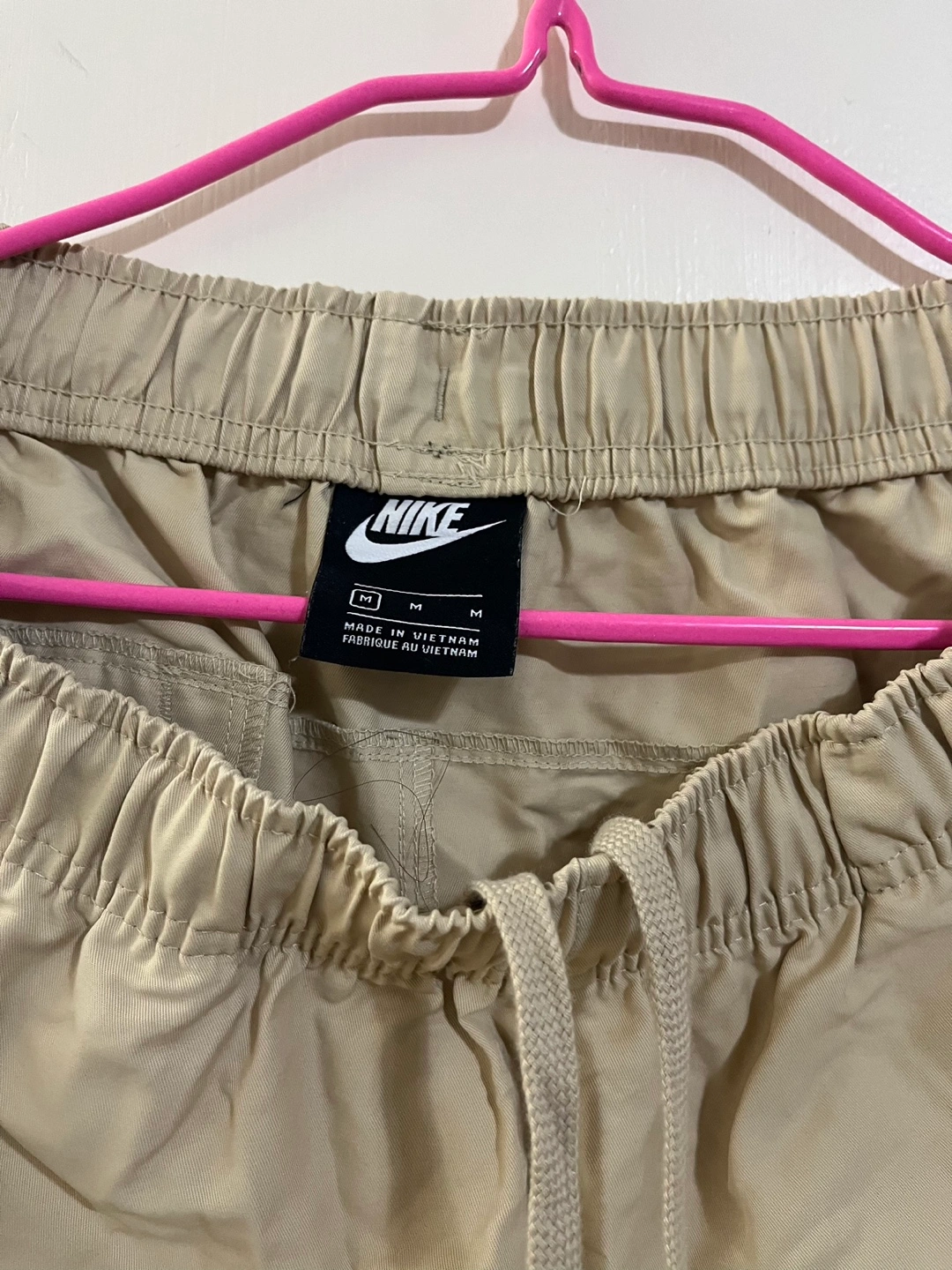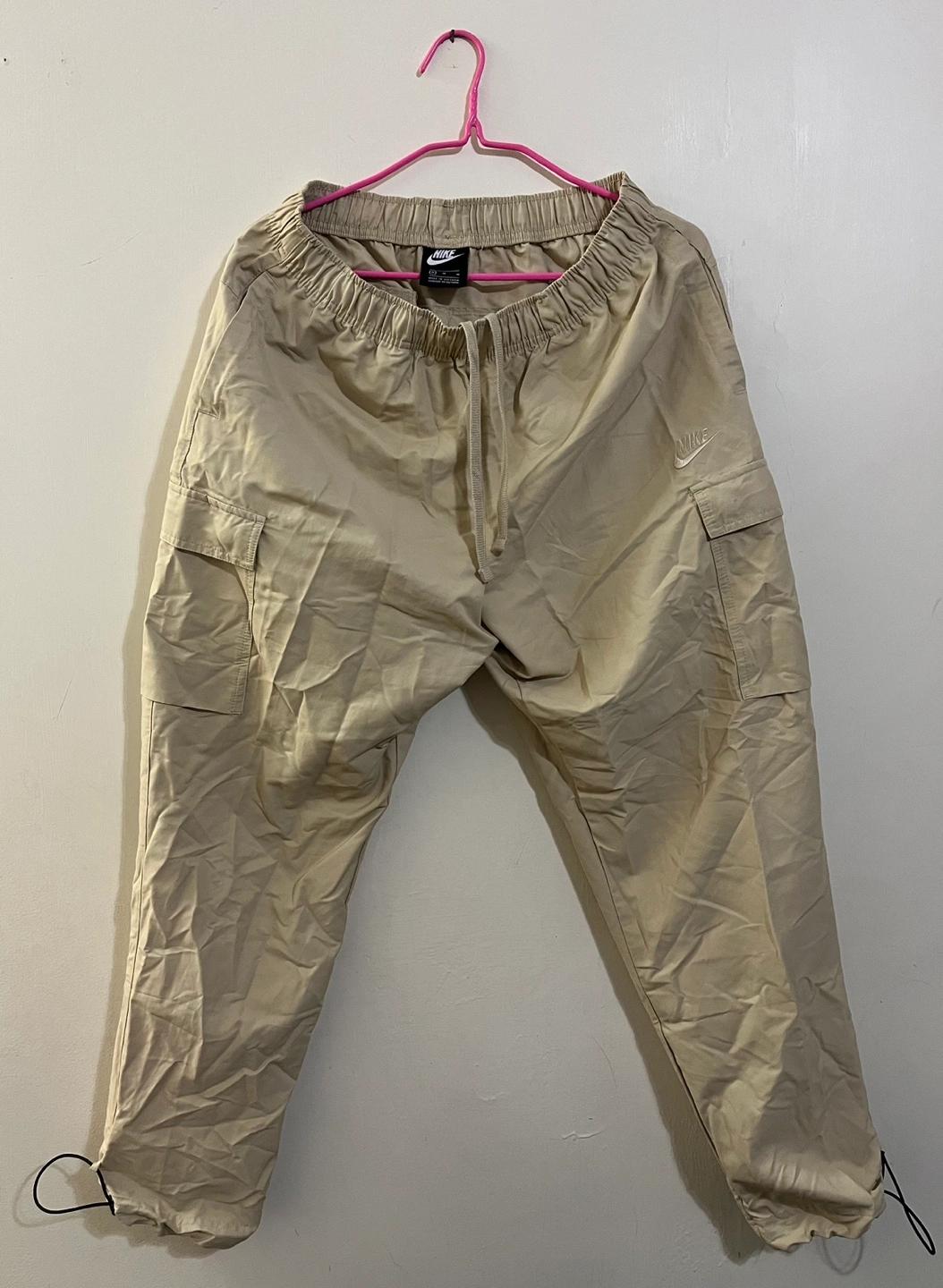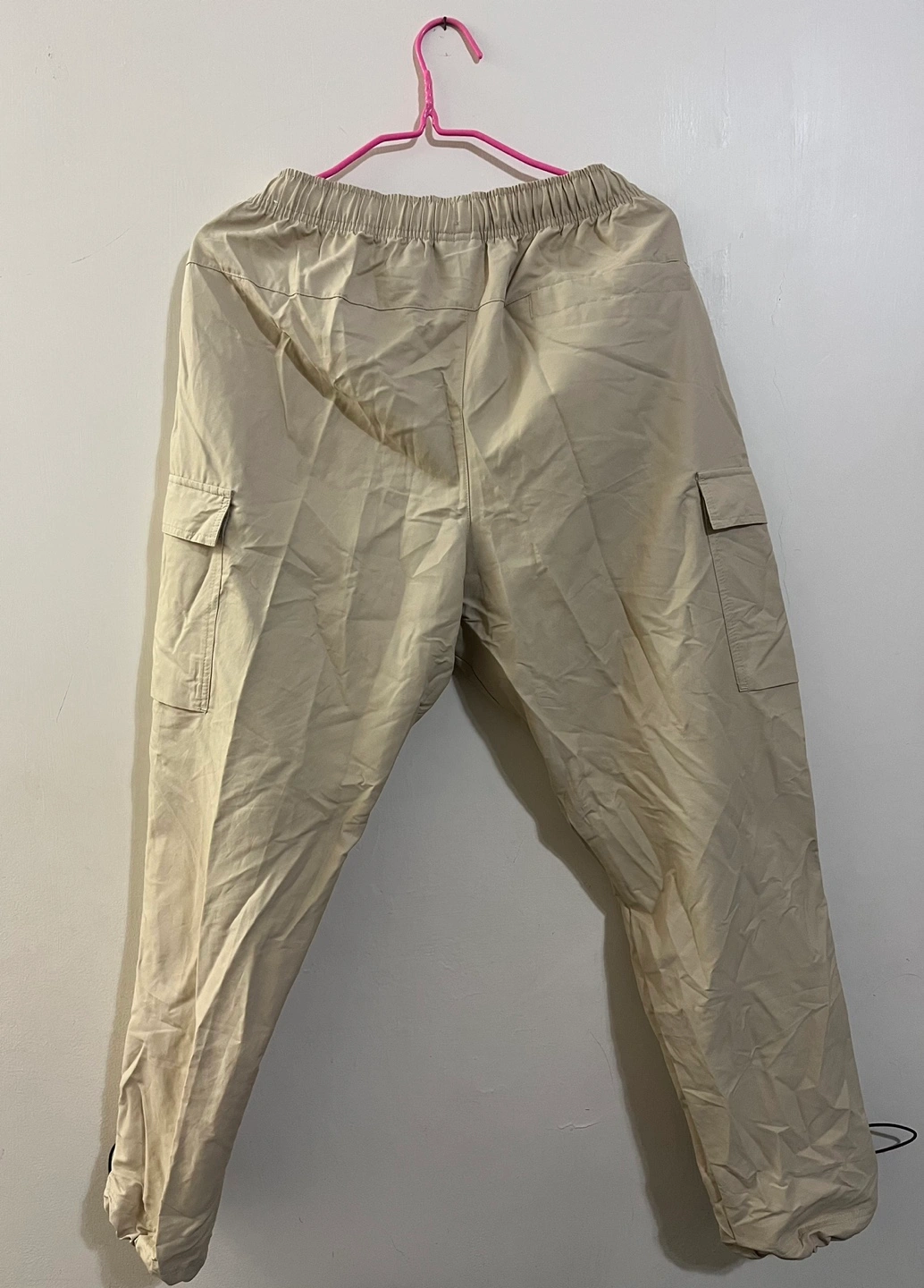 Beige cargo pants with an elastic waistband and drawstrings. Pickup at Eaton Centre or near Victoria Park Station.
