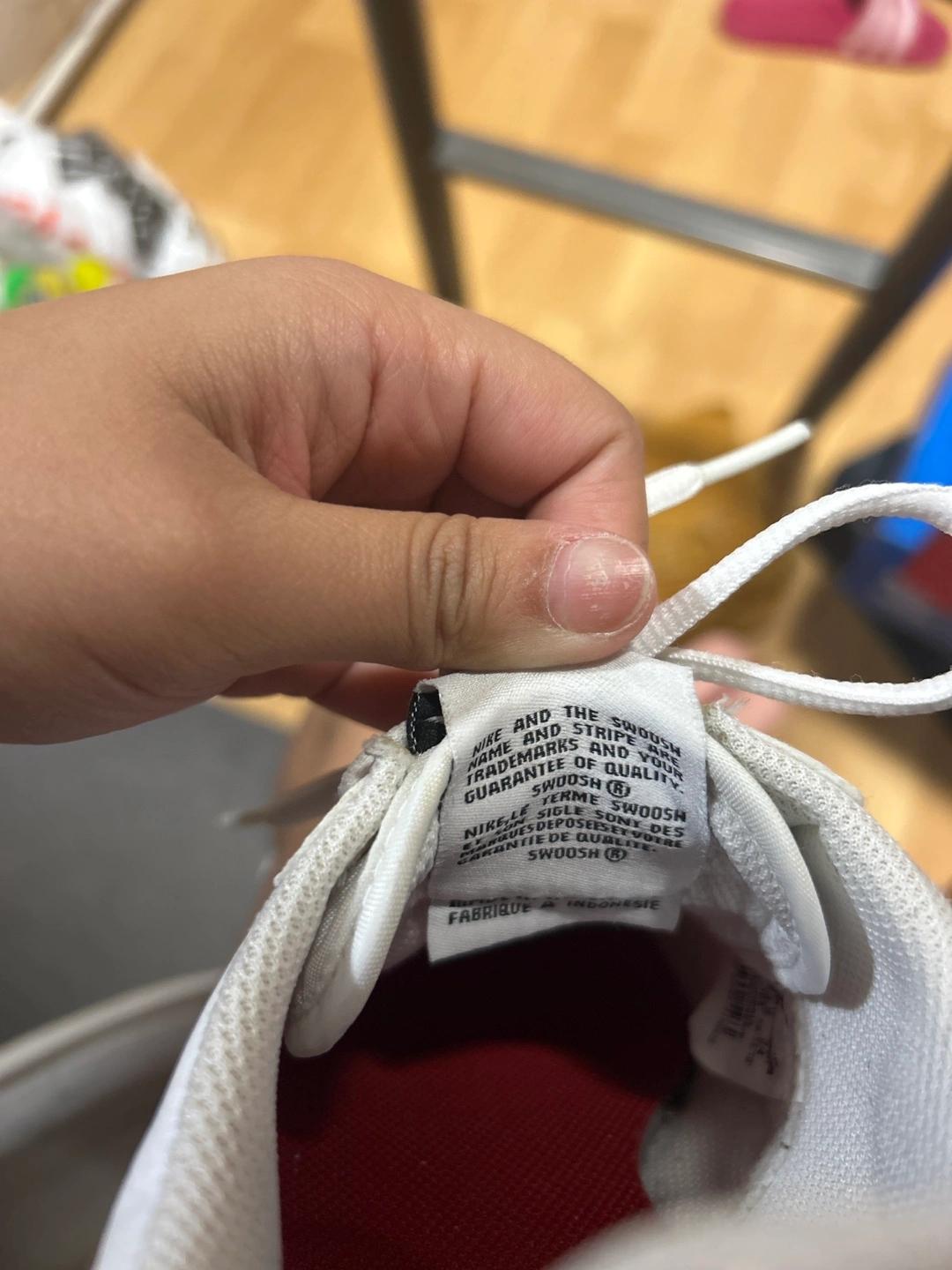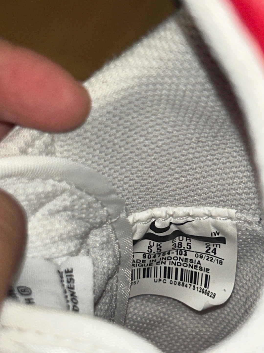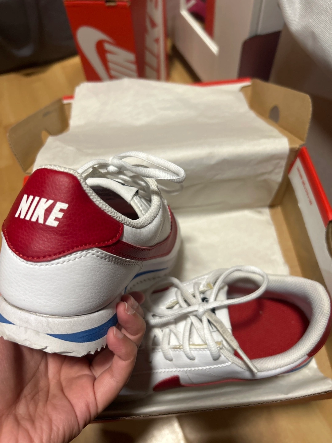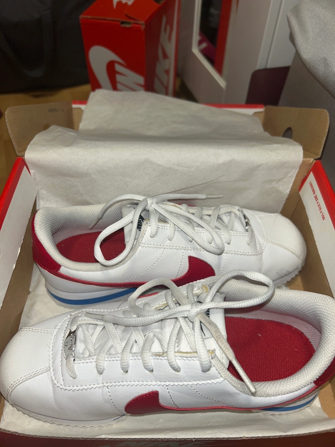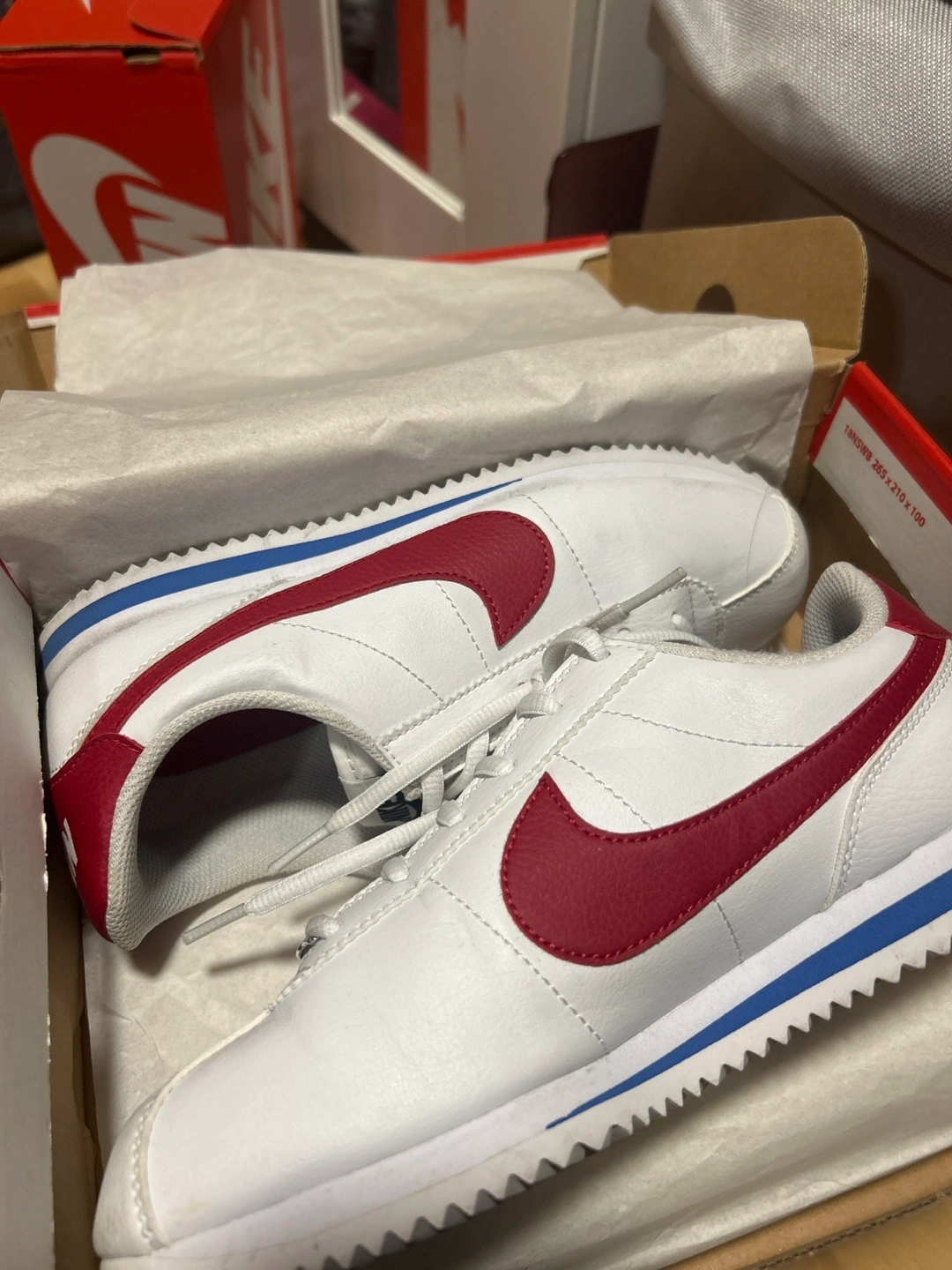 A pair of white shoes, with red and blue detailing. These shoes are in their original box. Imagine the joy of stepping into these comfortable shoes every day, it is truly a delight.