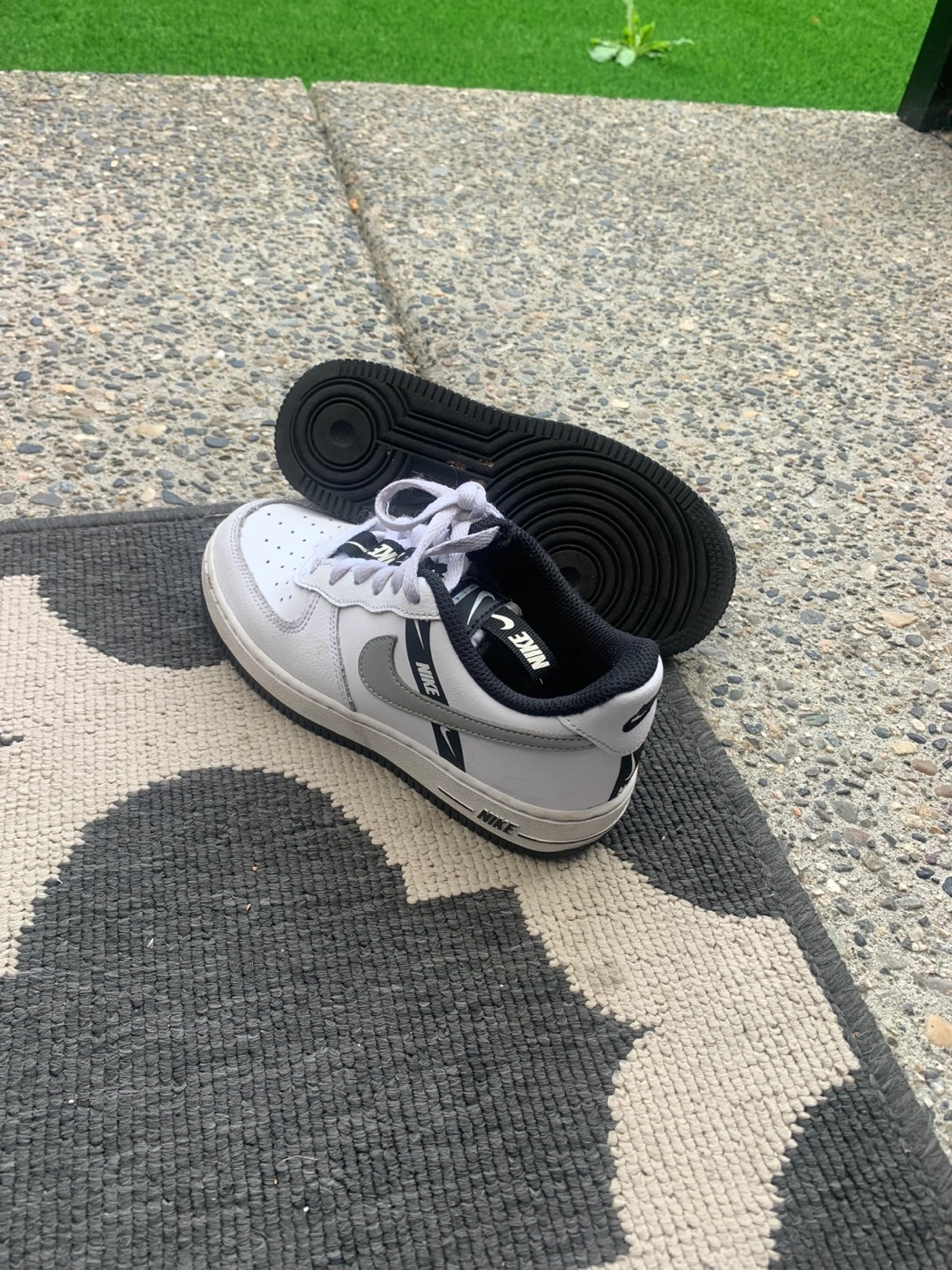 Here are some Nike Court Vision Low sneakers! They feature a white and grey colourway with black accents. Perfect for everyday wear!