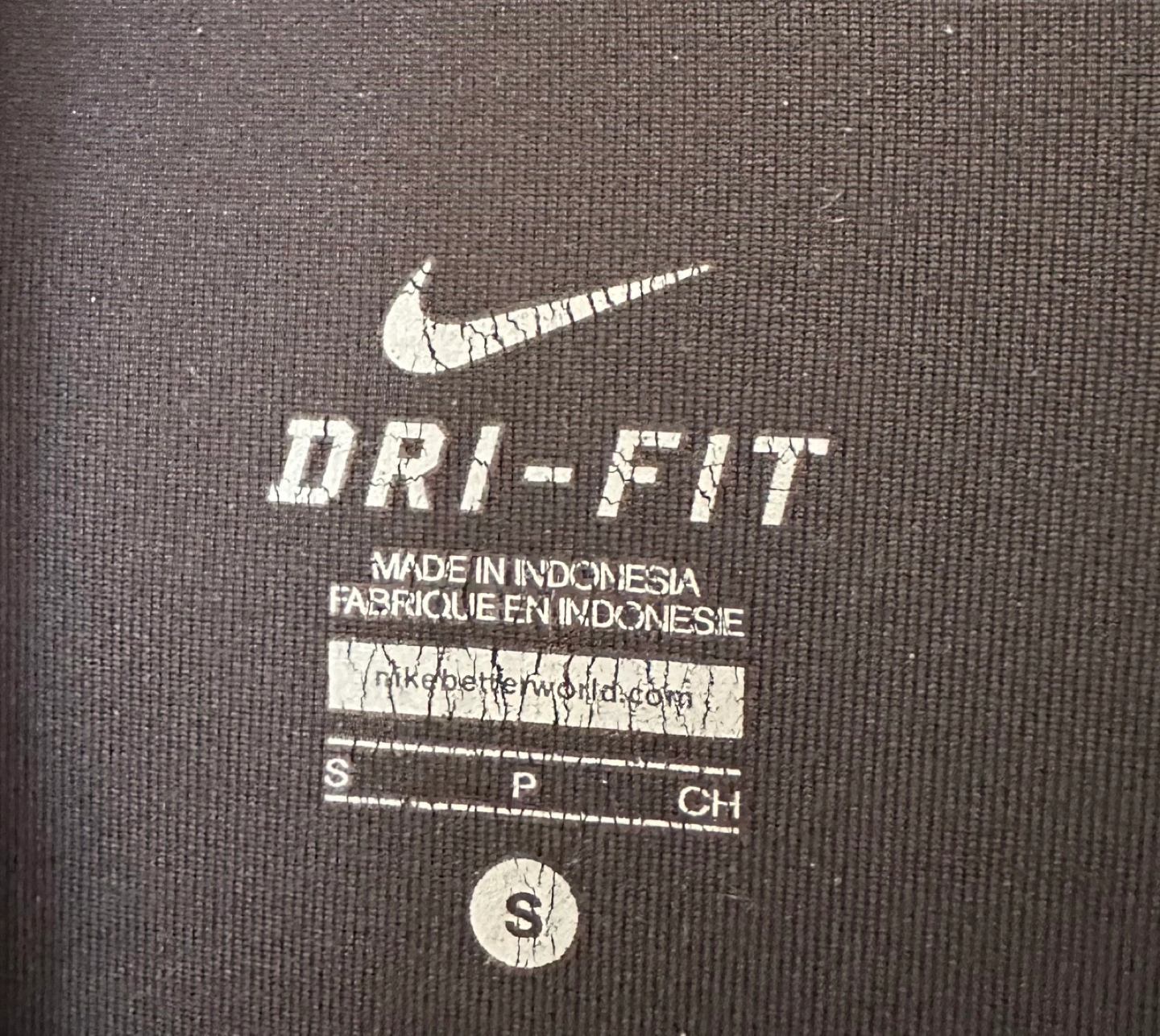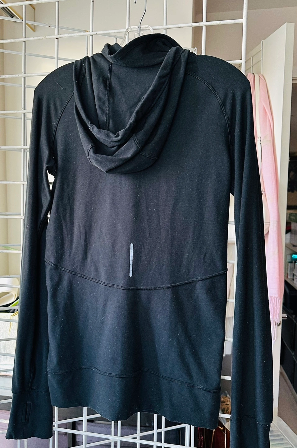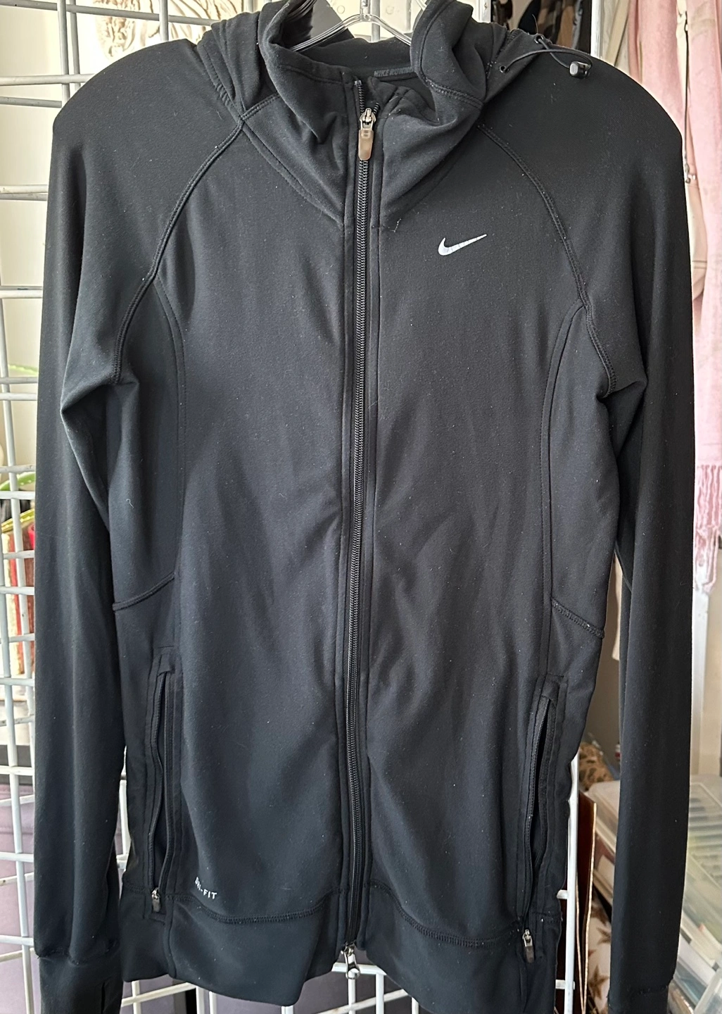 Black Nike Dri-Fit zip-up hoodie with a hood. Long sleeves with thumbholes. Two zippered pockets.