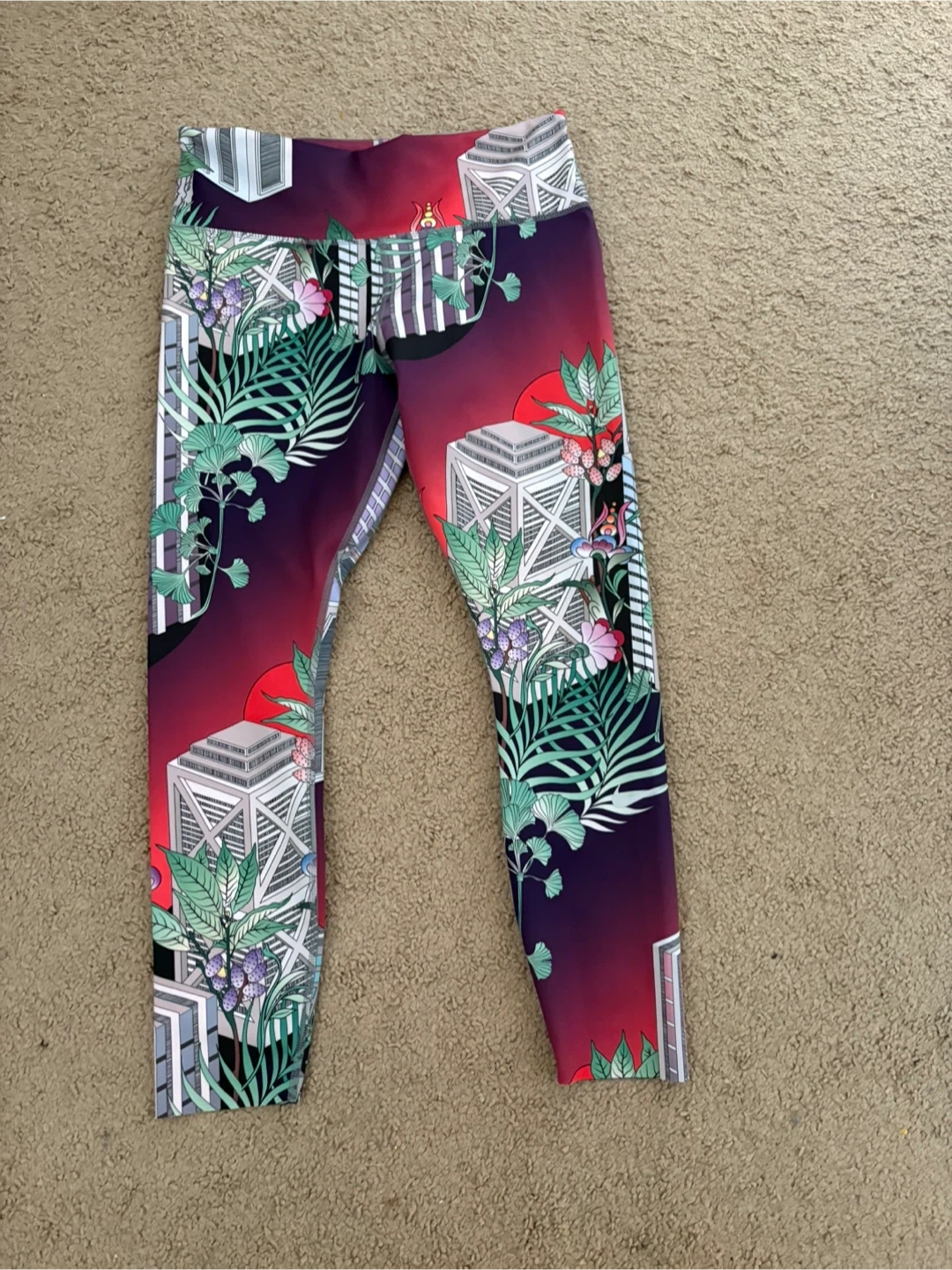 10Selling a pair of Nike Dri-FIT leggings in size large. They have a unique and vibrant pattern featuring buildings and foliage. Perfect for workouts or casual wear!