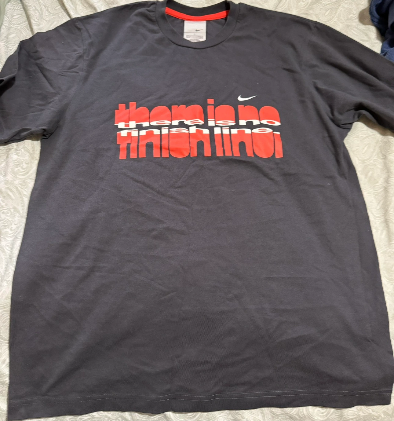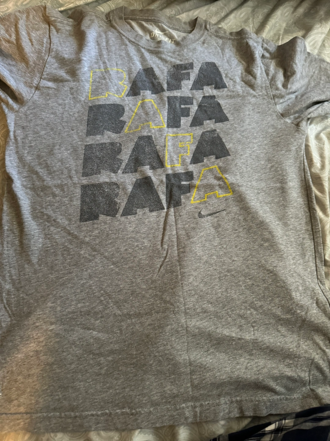 Two Nike Dri-Fit T-shirts. One is grey with "Rafa" printed on it and the other is black with grey stripes.