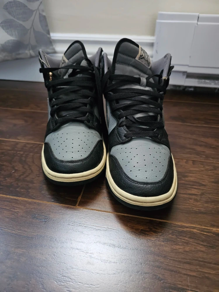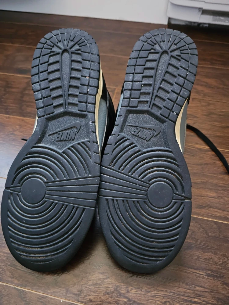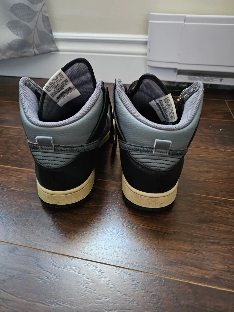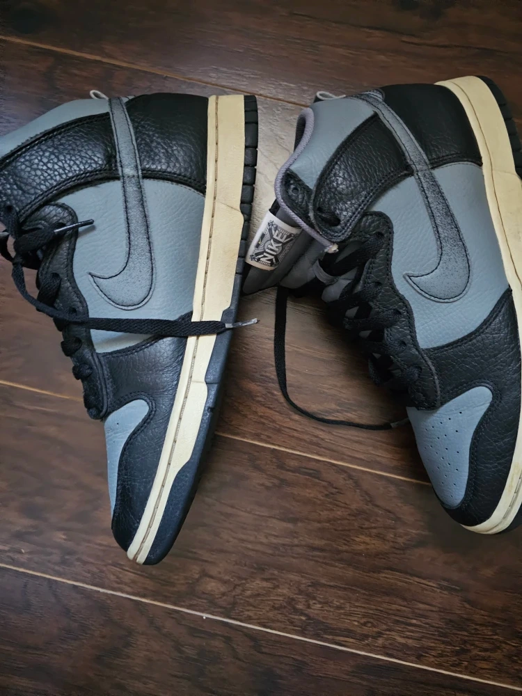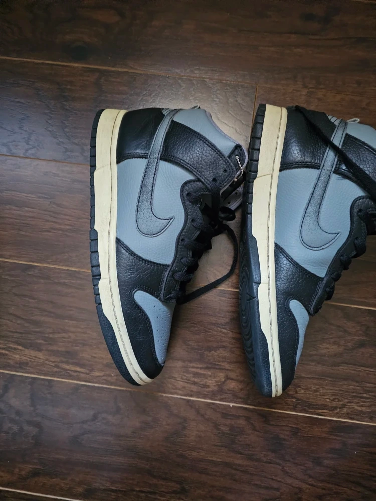 Selling a pair of Nike Dunk High sneakers in a stylish grey and black colourway! They show some signs of wear, as you can see in the photos. Size 9