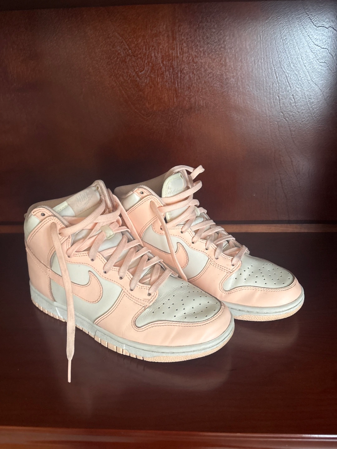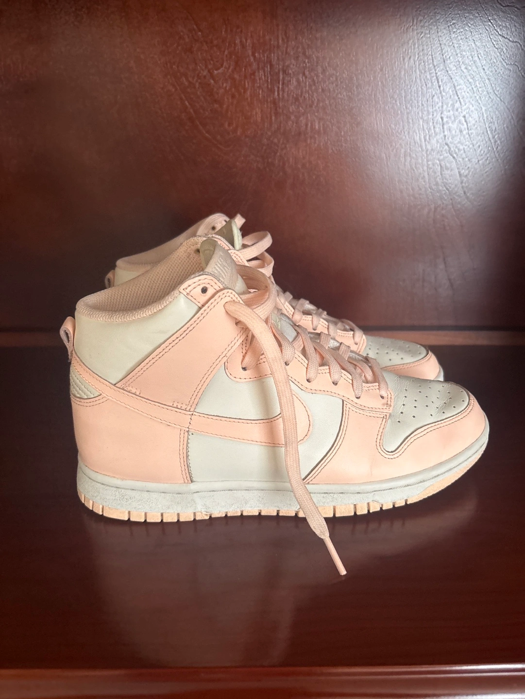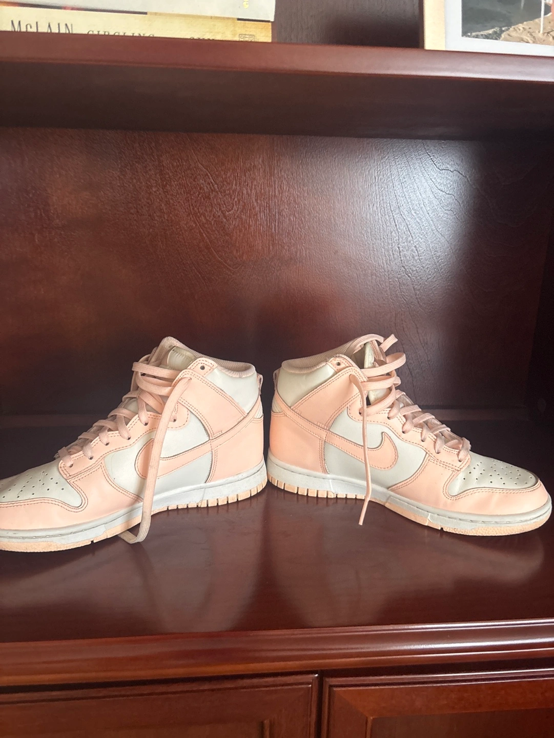 Pair of Nike Dunk Highs. Pink and white colourway. High-top sneakers. Lace-up closure. Pre-owned.