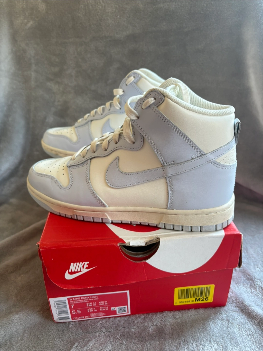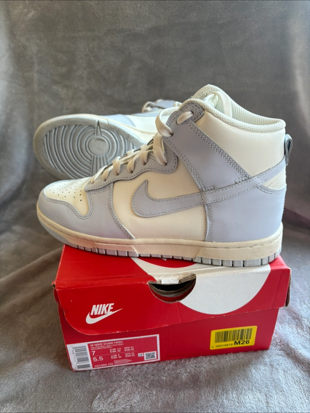 77Women's Nike Dunk High. Sail/Football Grey-Pale Ivory colour-way. Size 7 women’s or 5.5Y (kids). Lightly used, in original box.