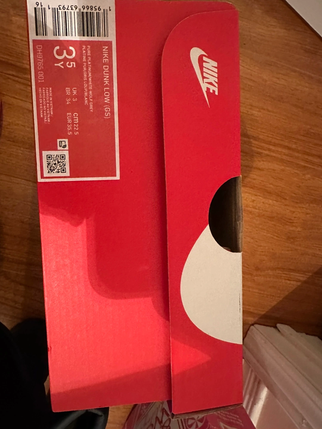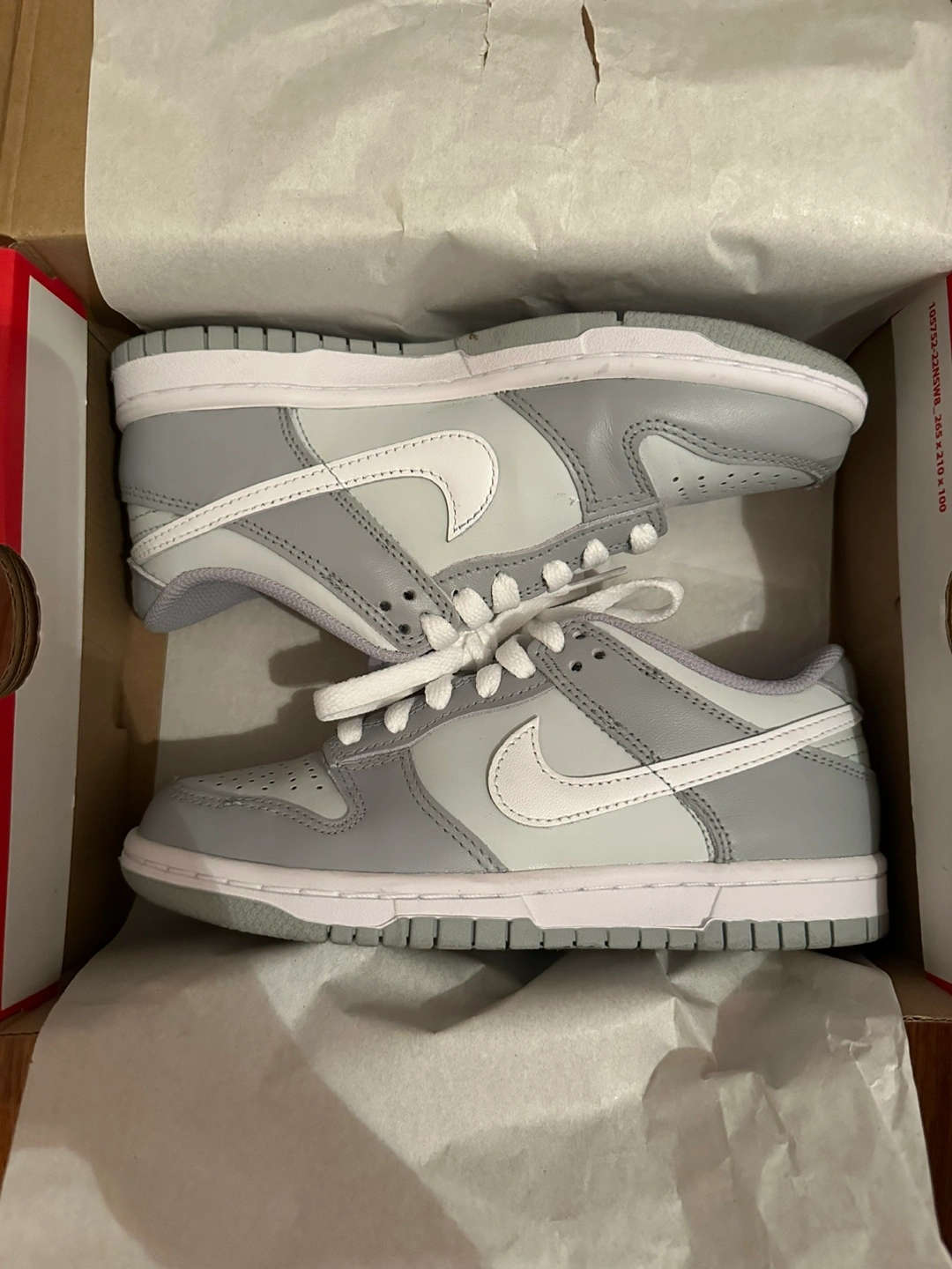 86Nike Dunk Low - Pure Platinum/Wolf Grey/White in a size 3.5 Youth (GS). Comes in the original box.