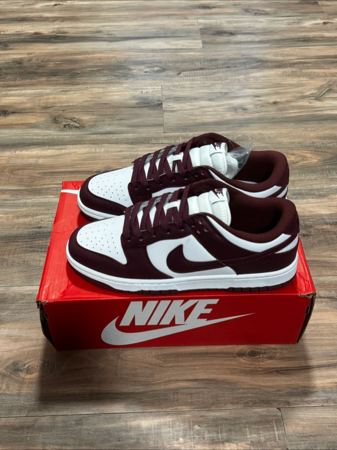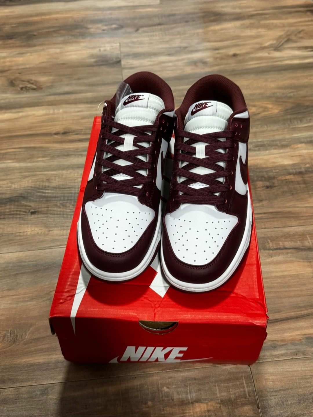 Here are a pair of Nike Dunk Low shoes in a stylish maroon colour! They are size US 8.5 and come with the original box. Perfect for everyday wear or adding to your sneaker collection
