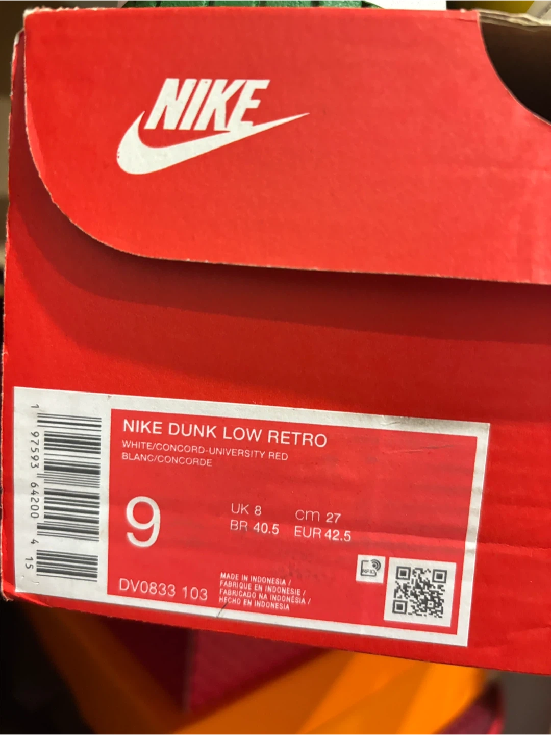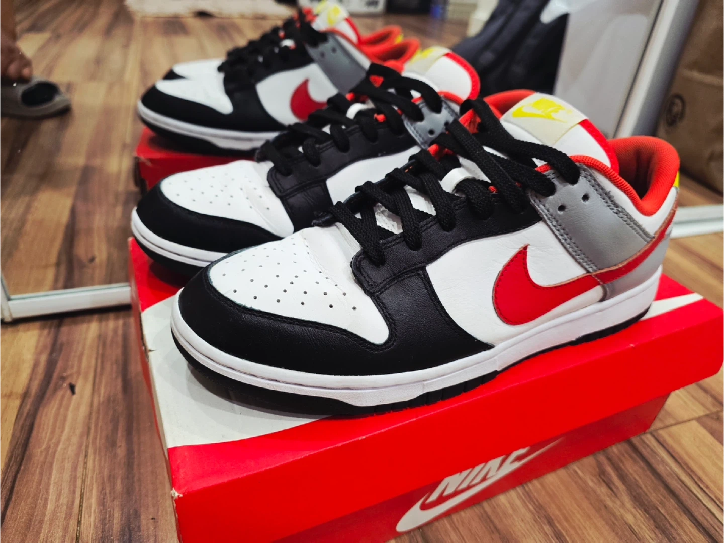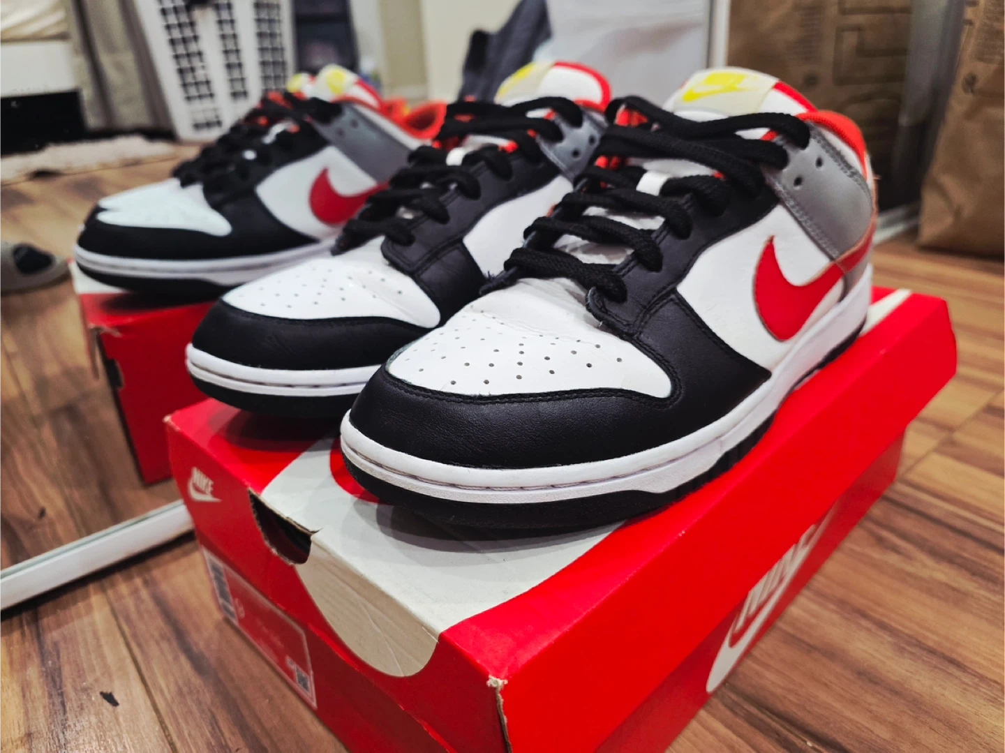 Selling a pair of Nike Dunk Low Retro shoes. They feature a stylish combination of black, white, red, and grey. They come with the original box!
