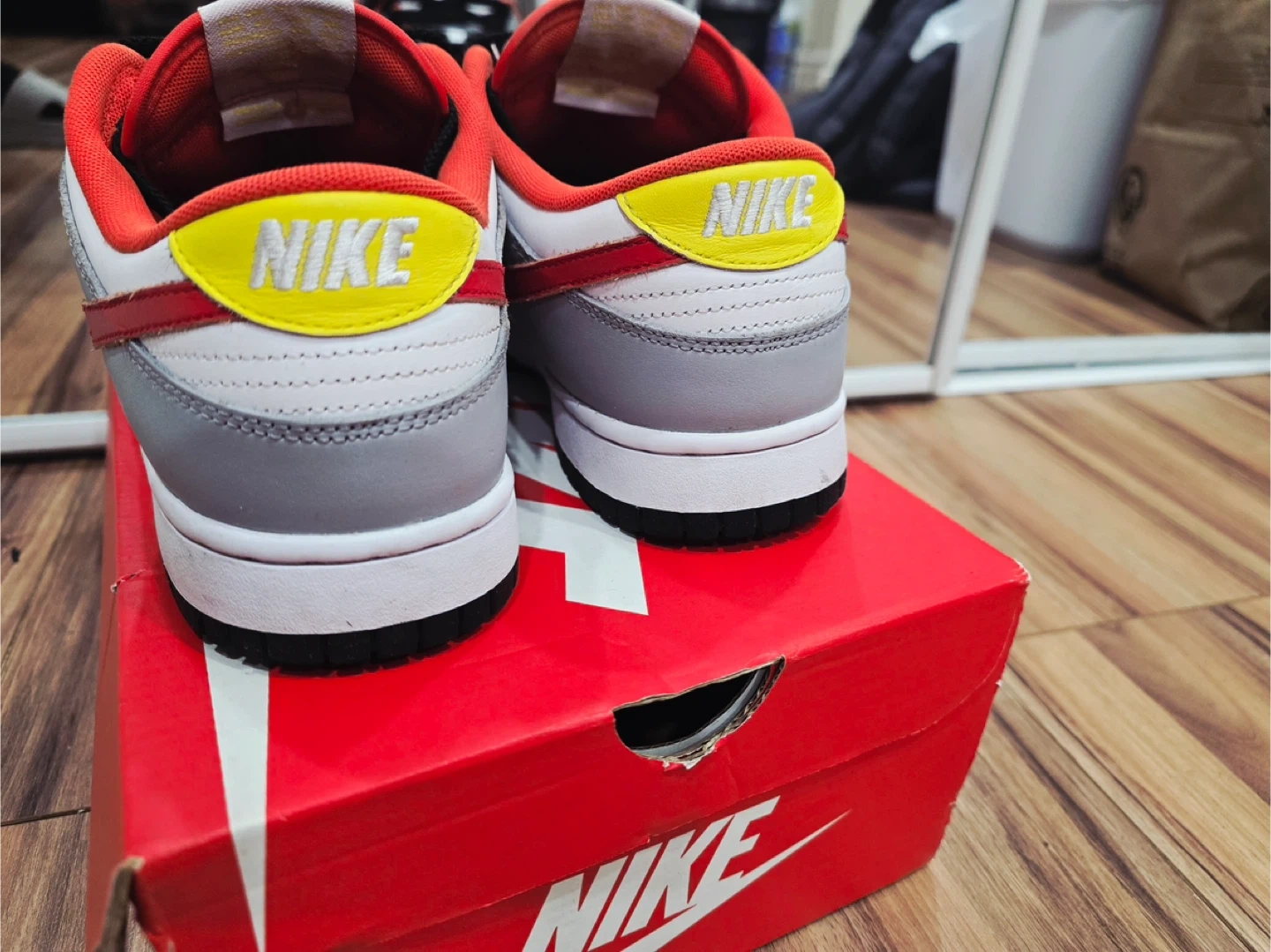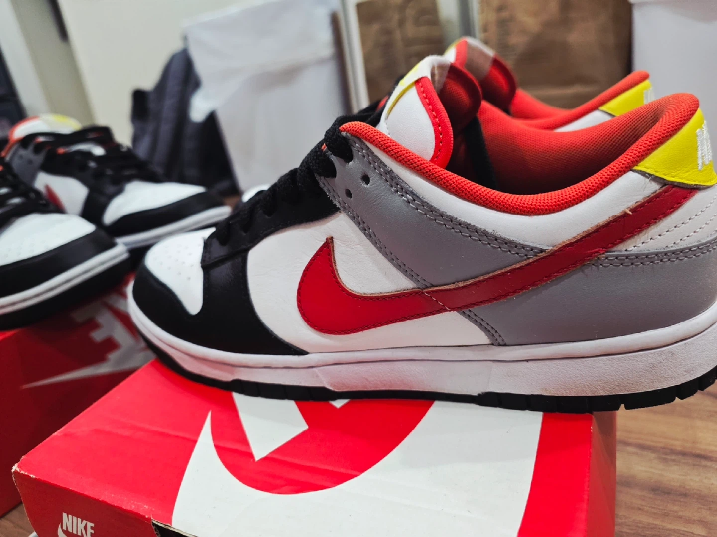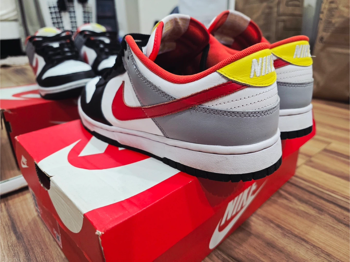 Selling a pair of Nike Dunk Low Retro shoes. They feature a stylish combination of black, white, red, and grey. They come with the original box!