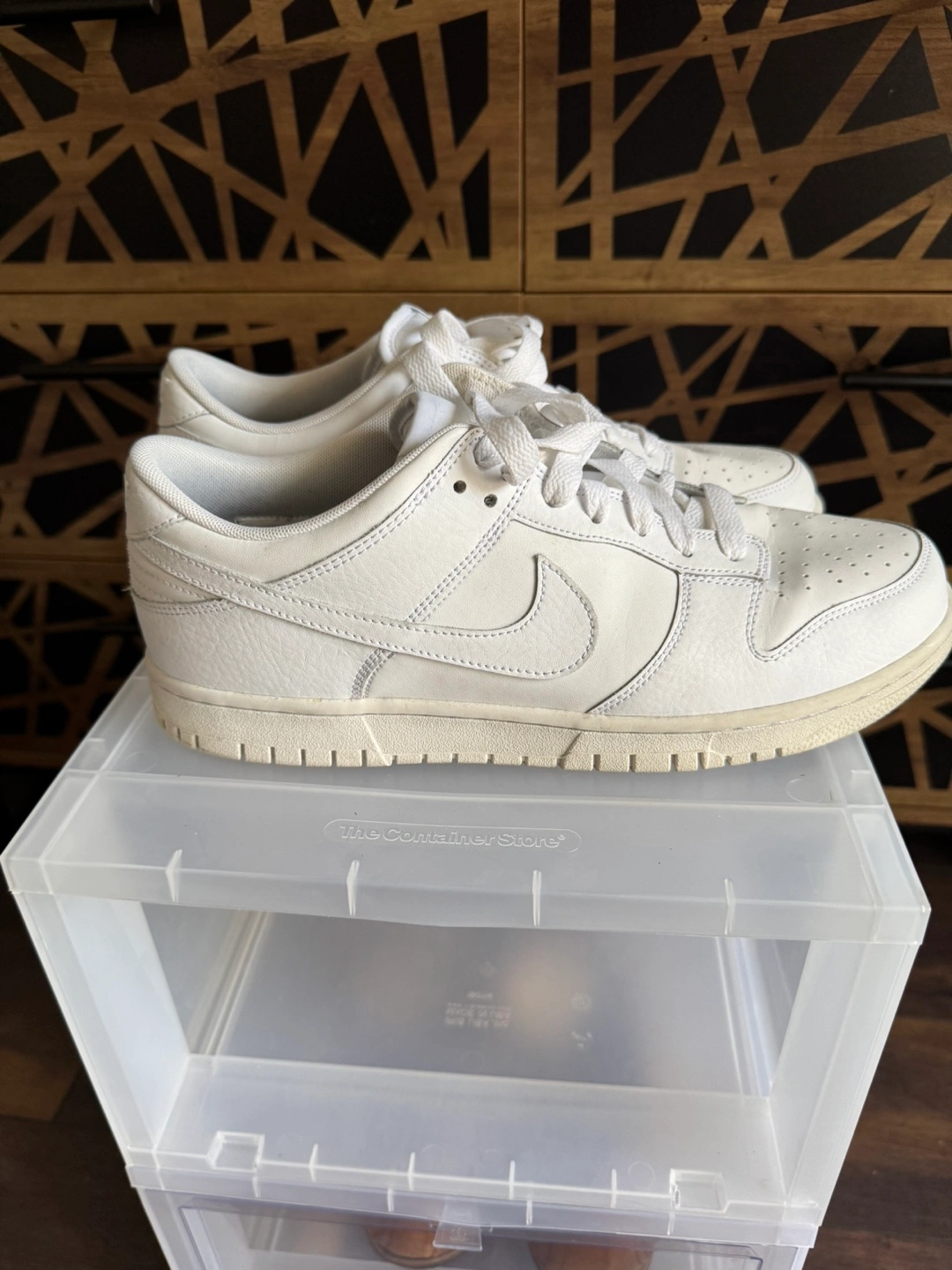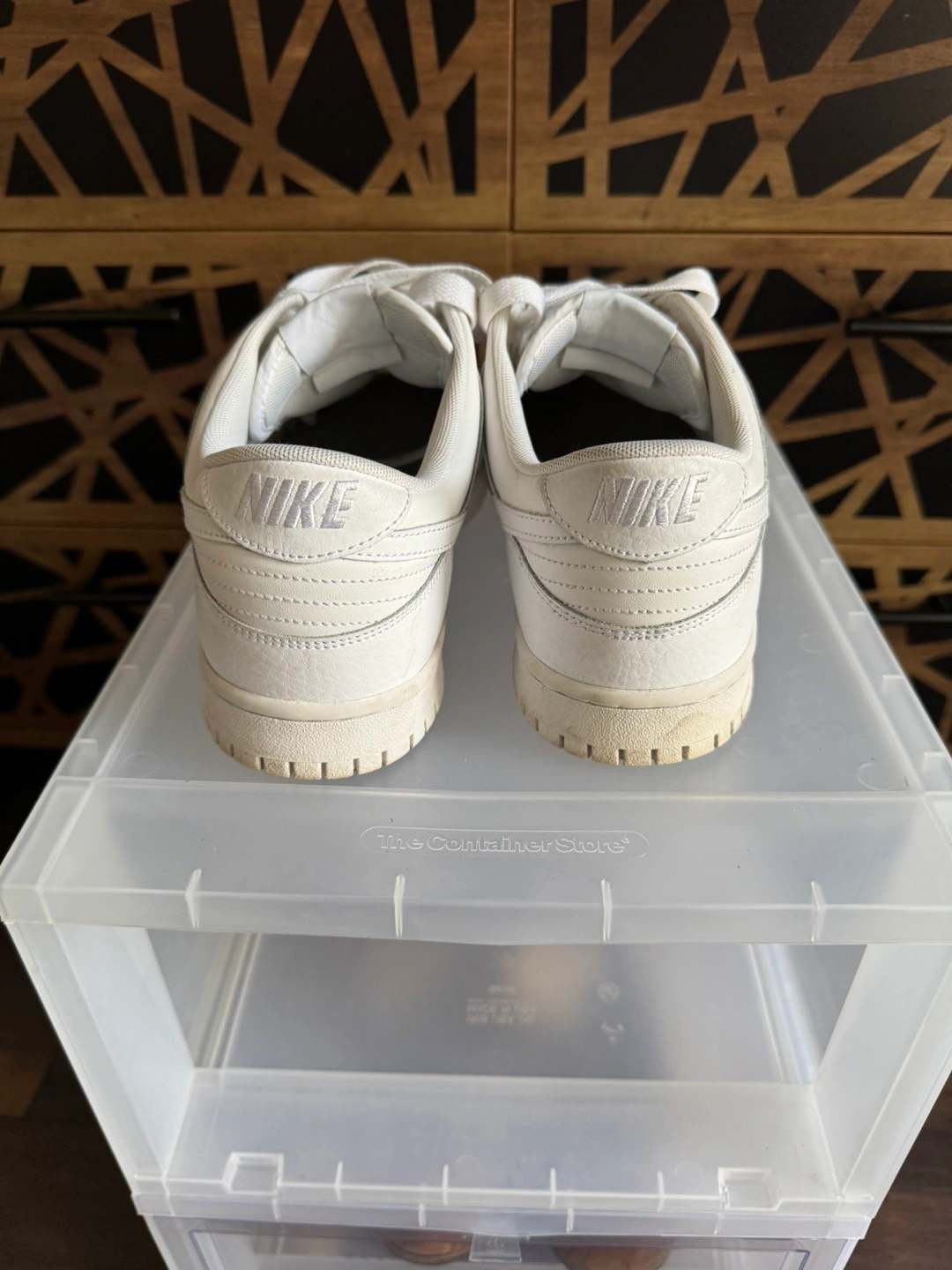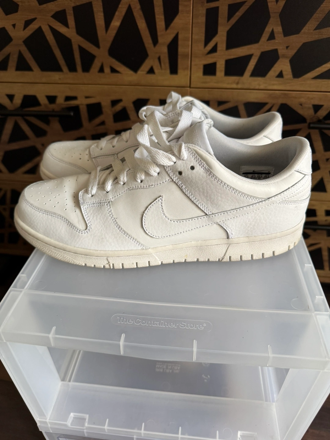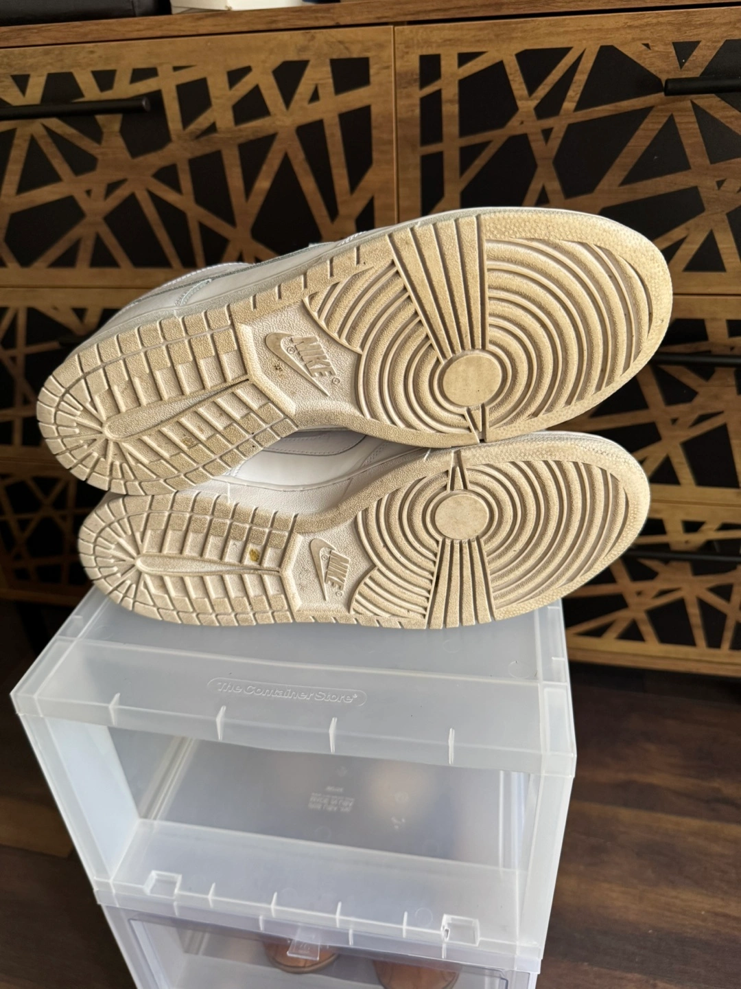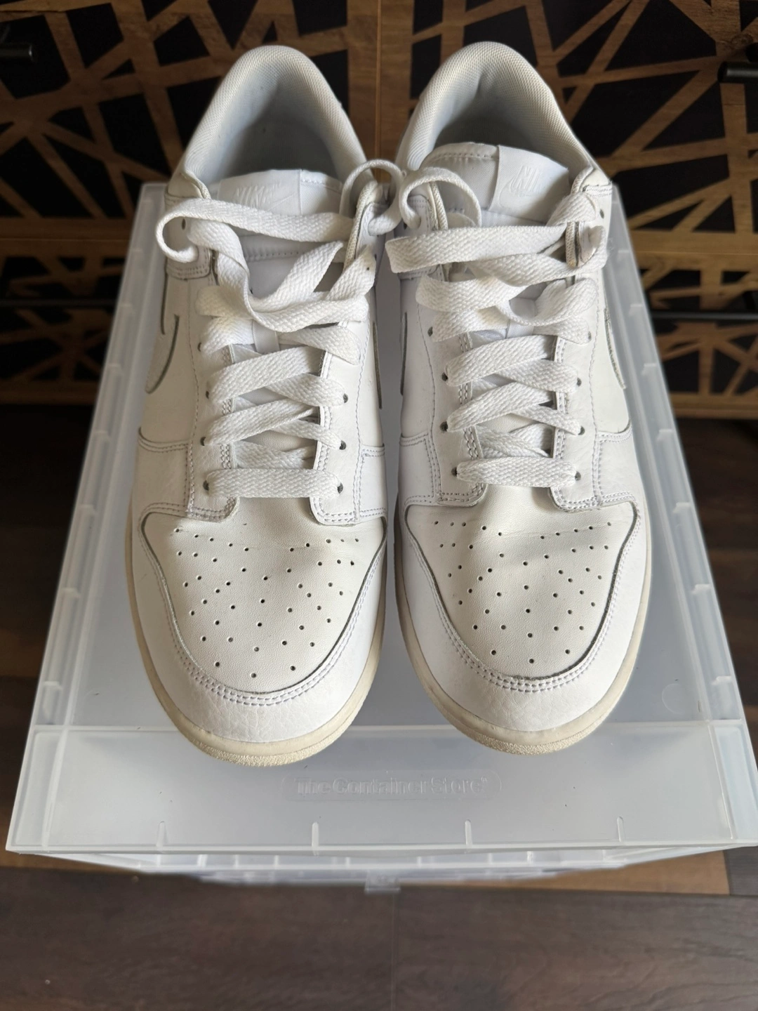 Selling a pair of Nike Dunk Low shoes in white. They show some signs of wear on the soles, but the upper part is still in good condition. Please see the photos for details!
