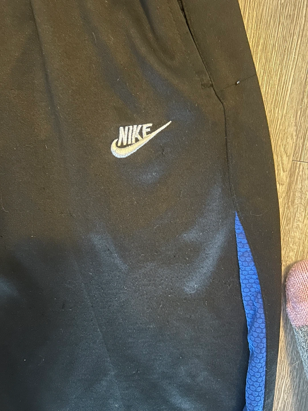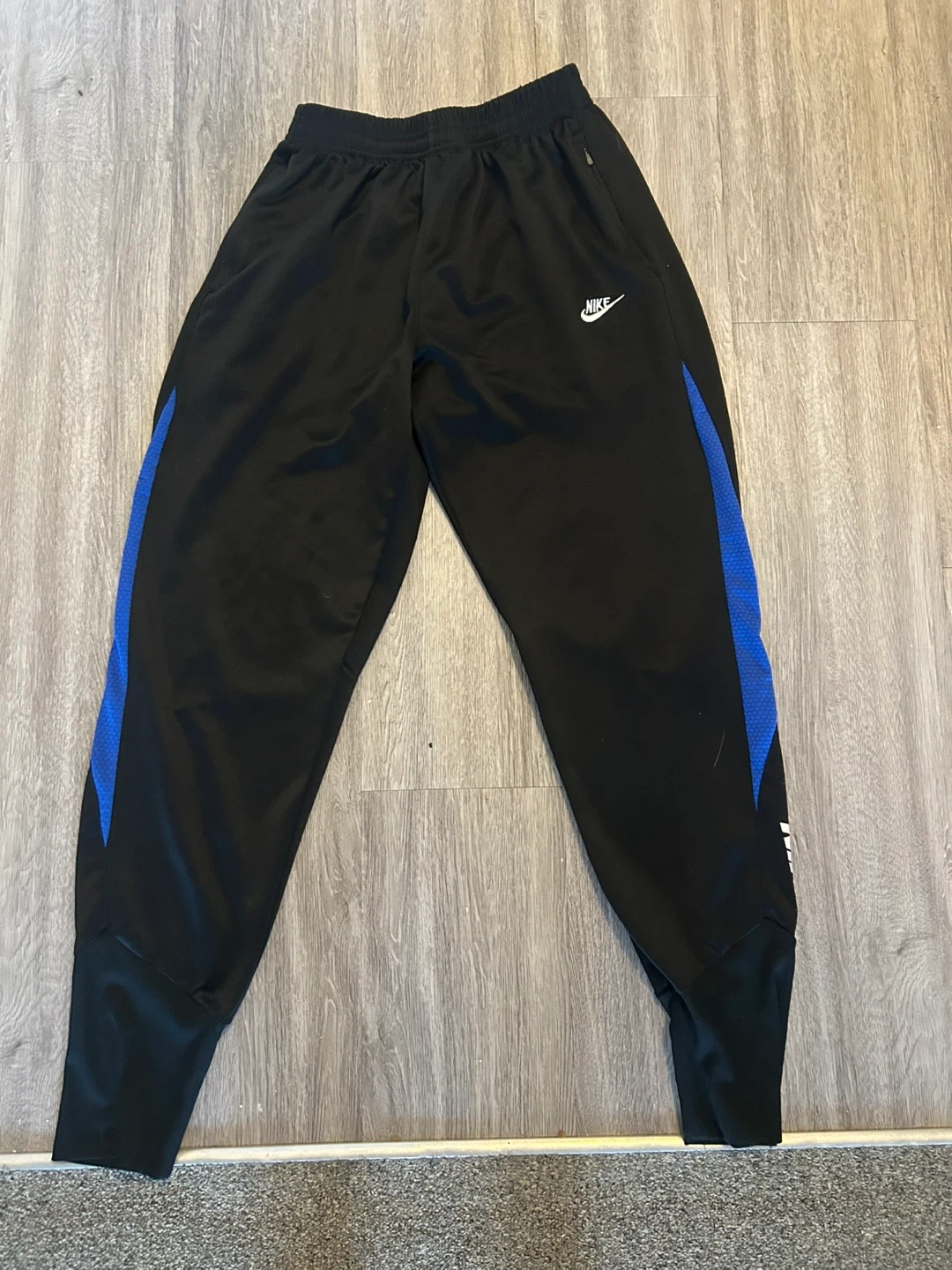 45Selling a pair of Nike FitDry track pants in black. They have a blue accent and the Nike logo on the leg. Great for workouts or just lounging around!Size Medium . Smoke Free Home No porch pick up Pick up only Beatrice and Wilson Oshawa