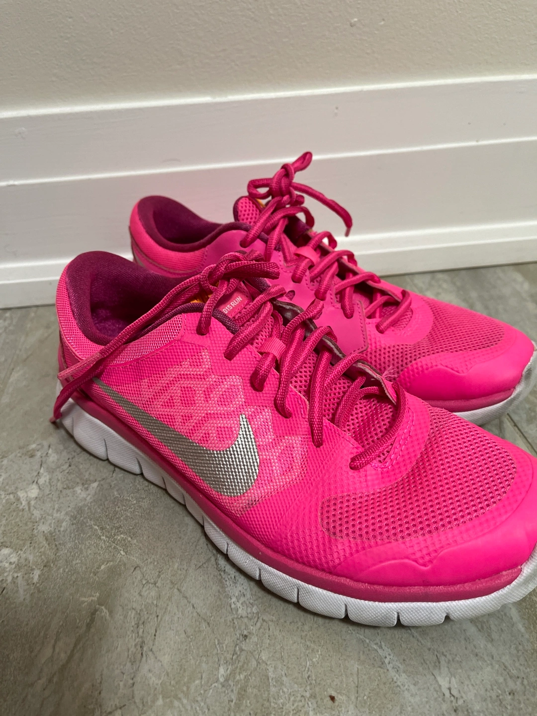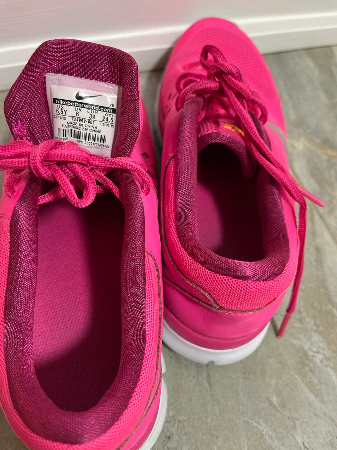 Pink running shoes with a white sole. , which is a US women's size 7.5. The shoes are in good condition.