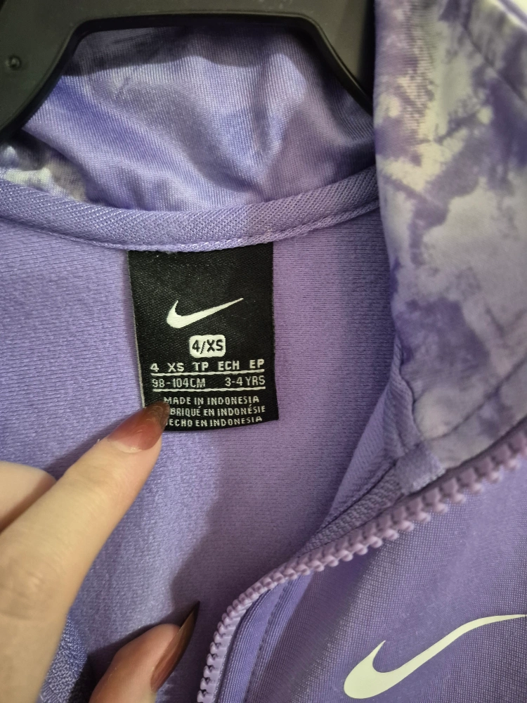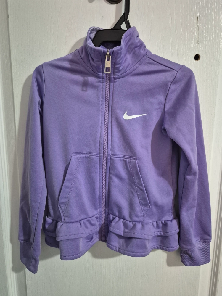 Purple Nike zip-up track jacket. Size 4/XS. Features a ruffled hem. Good condition.
