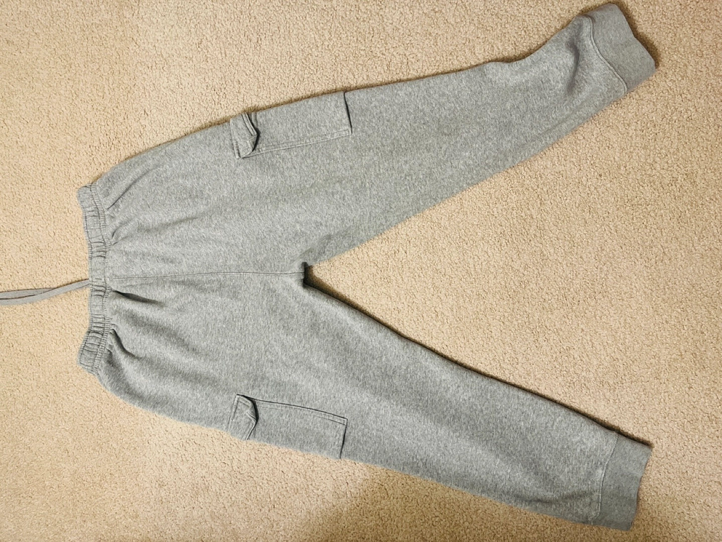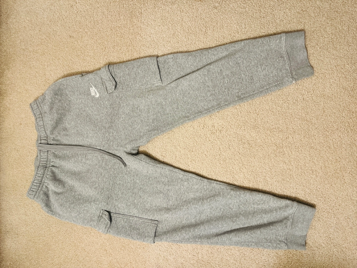 Grey Nike cargo joggers. Drawstring waist. Side pockets. Great for lounging or working out.