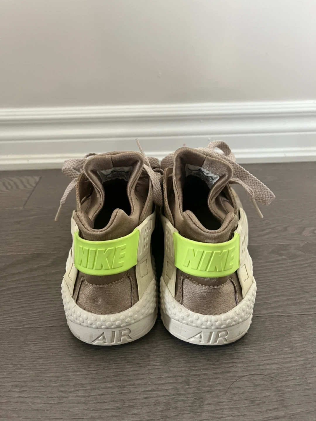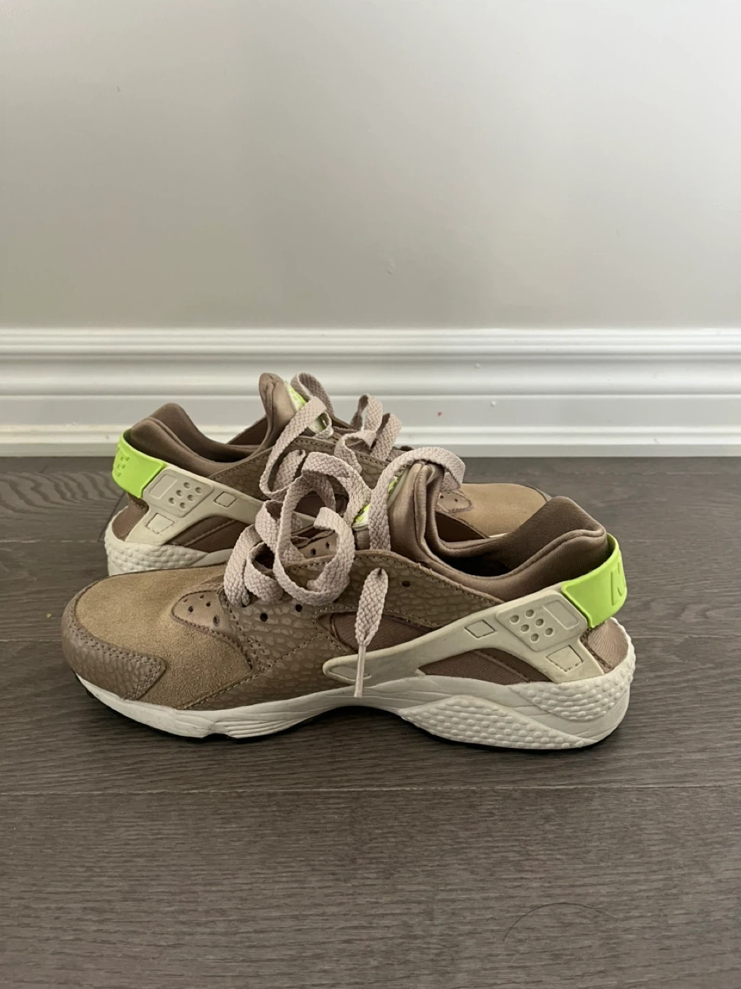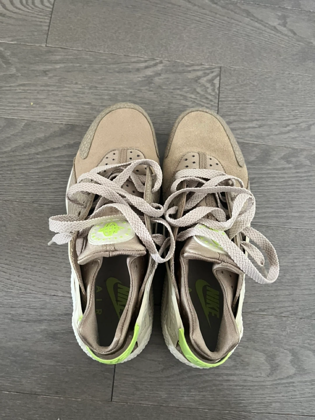 60Selling a pair of Nike Huarache sneakers! These are in good condition, perfect for everyday wear. They feature a unique design with a comfortable fit. The colour is a neutral brown with a pop of neon green on the heel. Great for adding a stylish touch to your casual outfits