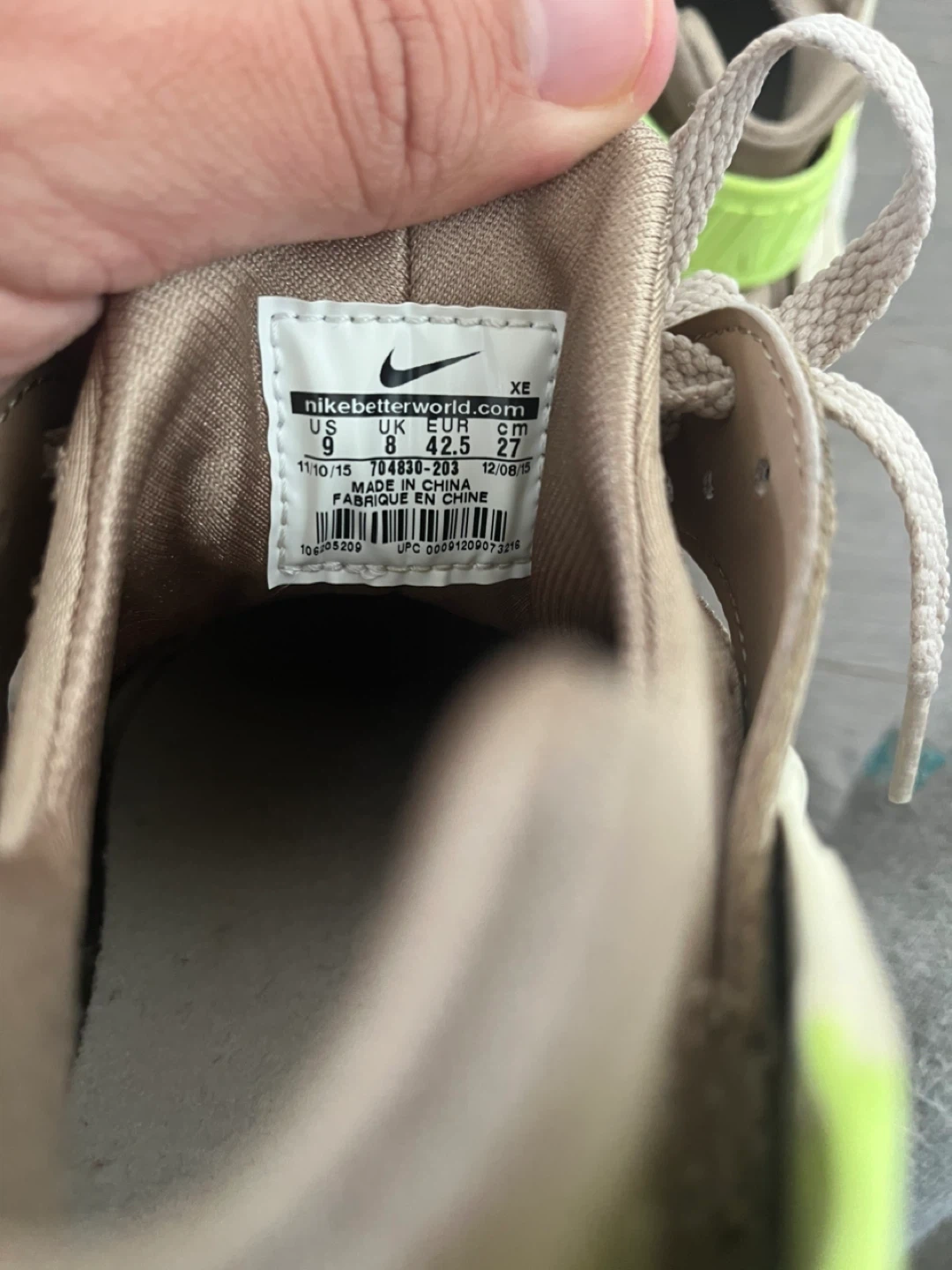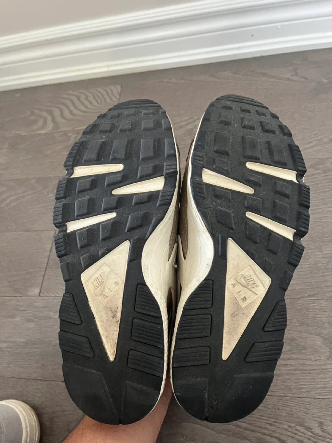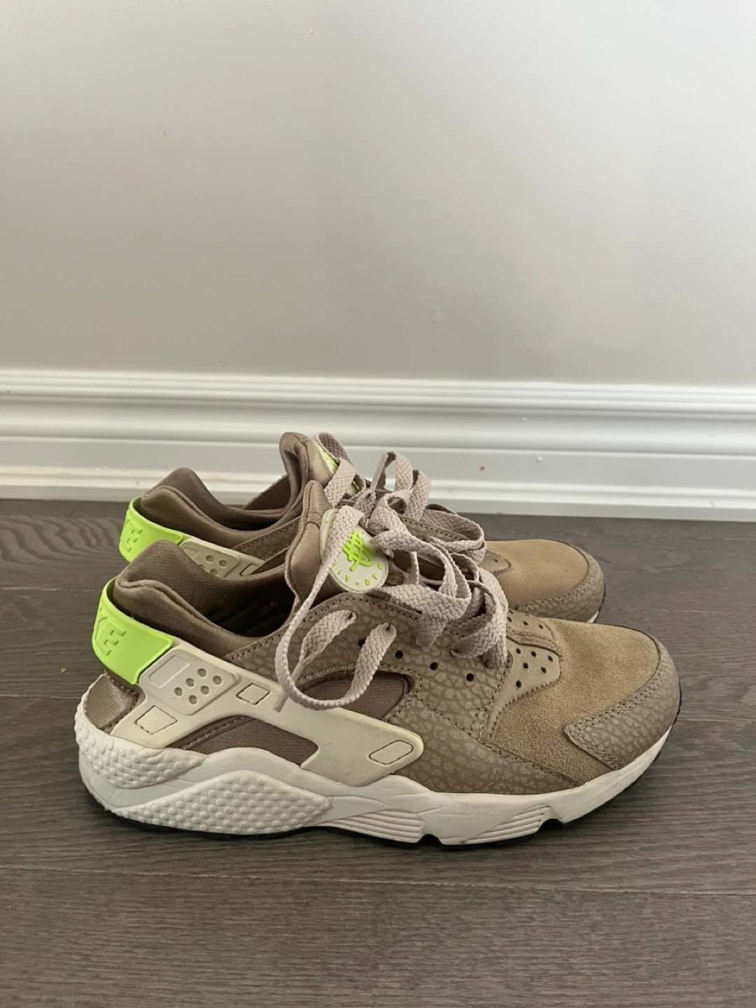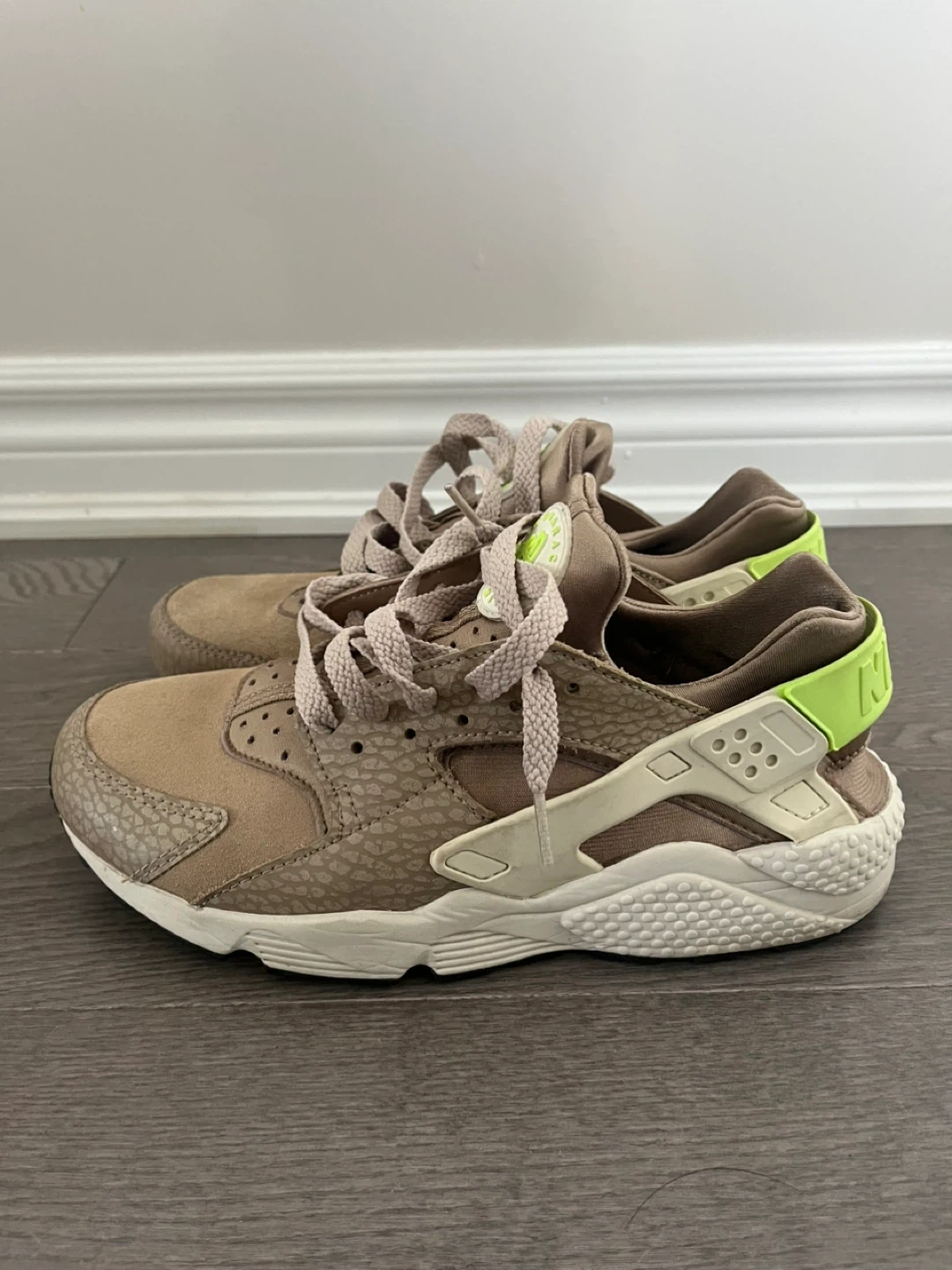 60Selling a pair of Nike Huarache sneakers! These are in good condition, perfect for everyday wear. They feature a unique design with a comfortable fit. The colour is a neutral brown with a pop of neon green on the heel. Great for adding a stylish touch to your casual outfits