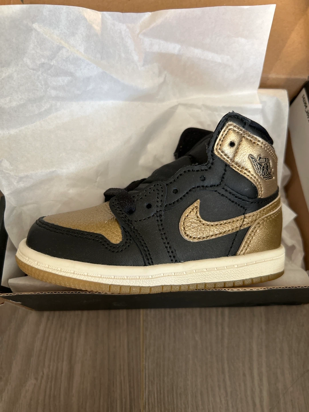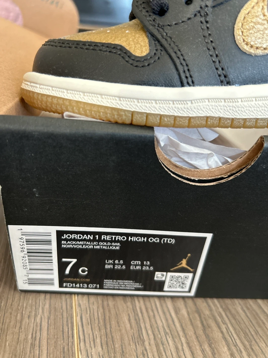 70These adorable Jordan 1 Retro High OG sneakers are perfect for your little one! They come in a stylish black and metallic gold colourway. The size is 7C (Toddler). They come with the original box.