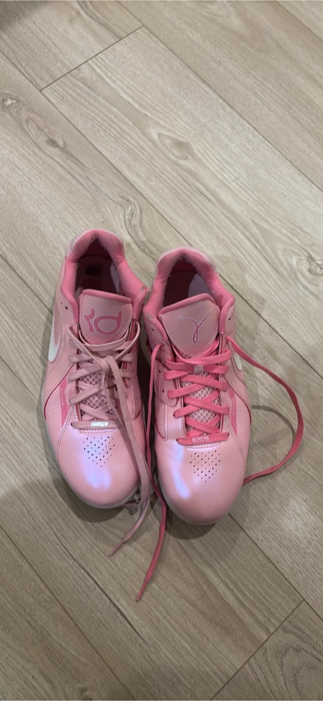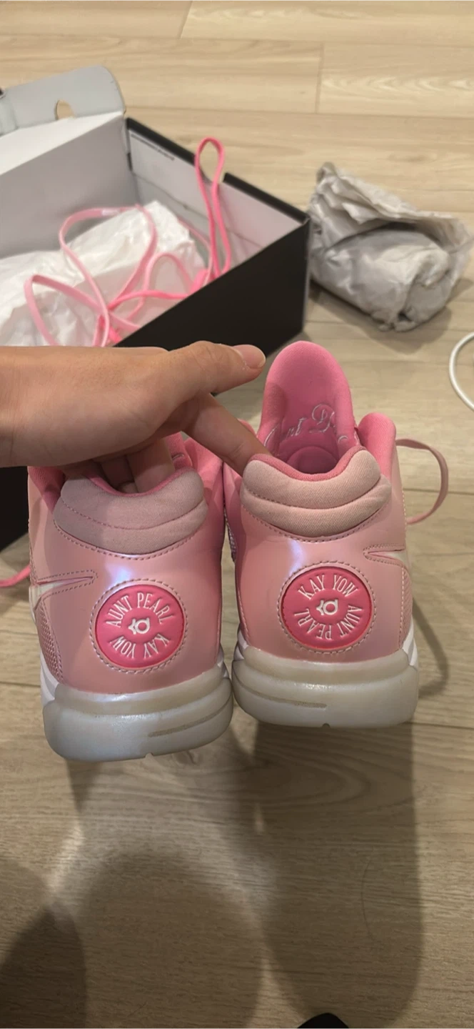 10Selling a pair of Nike KD Aunt Pearl shoes in pink. They show some signs of wear, as seen in the photos, but still have lots of life and grip left. Have receipts from stockX boxes and extra laces included as shown