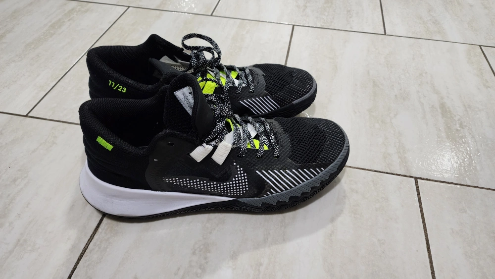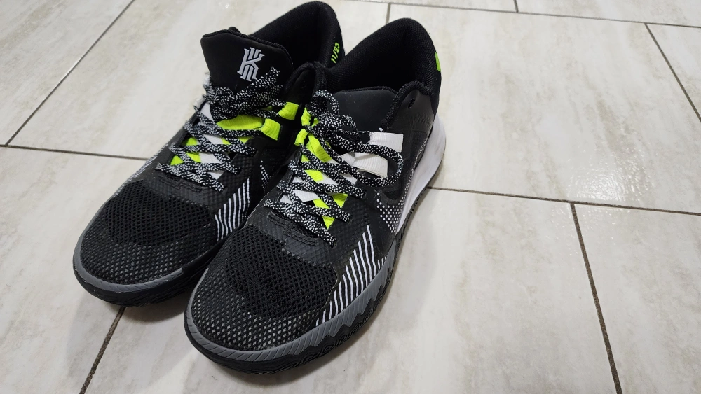 Selling a pair of Nike Kyrie Flytrap 5 basketball shoes in US size 9! They're in great shape and ready for the court or casual wear. The shoes feature a stylish black and white design with neon green accents on the laces and sides
