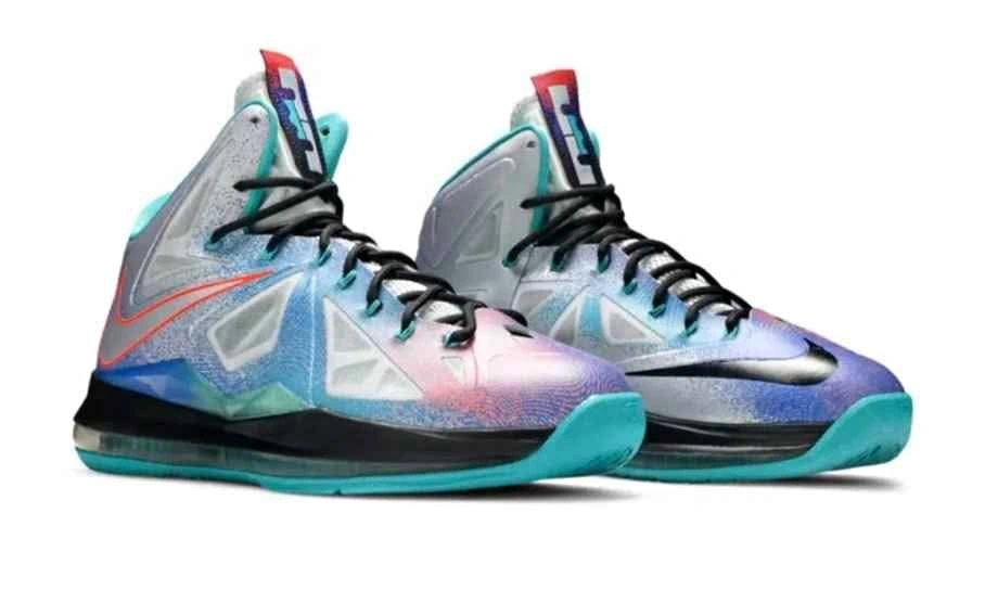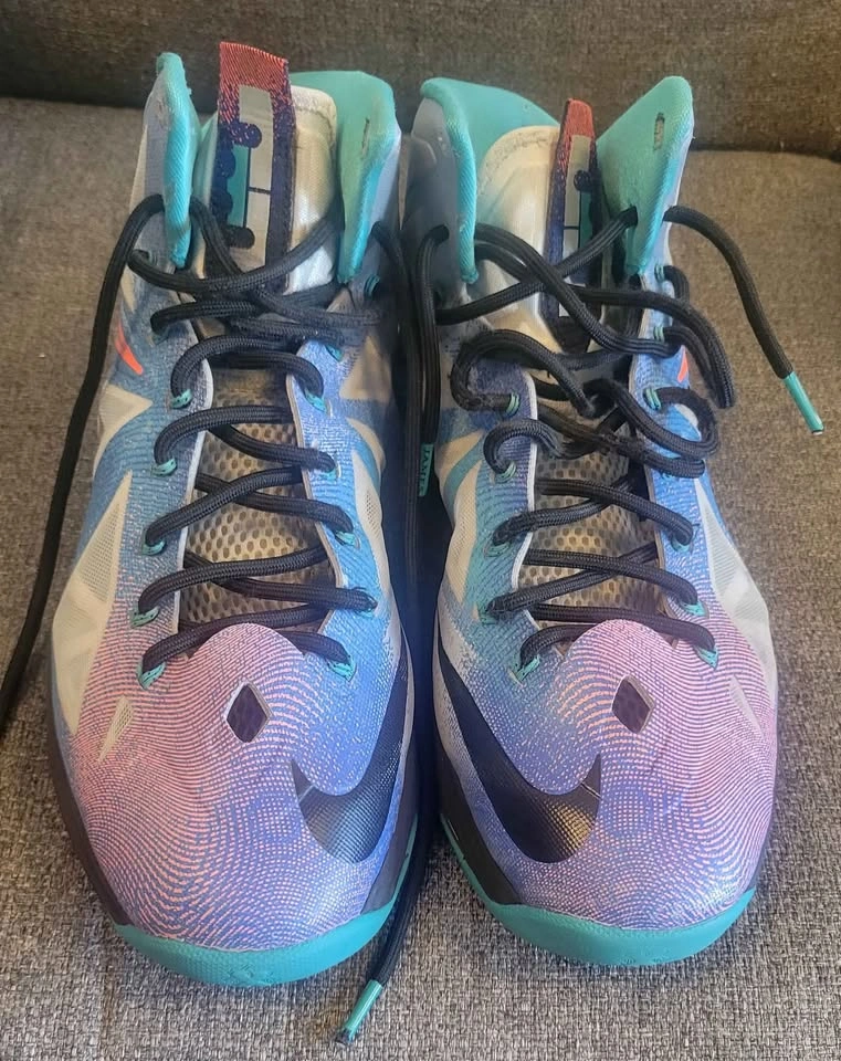 Nike LeBron 10 basketball sneakers, men’s size 11.5. Known for their bold design and high-performance build, this pair features: Multi-color upper (blue, purple, orange accents) with signature Nike Swoosh Full-length Zoom Air cushioning for comfort and responsiveness Durable outsole with strong traction pattern Lightweight Flywire support for a locked-in feel Condition: Pre-owned, gently used Ready to wear Wear on inside of right shoe (insole graphic and insole worn down; left shoe intact swe pics) Light fraying on original laces (still functional) Minor outsole wear, uppers in good overall condition No rips or structural damage