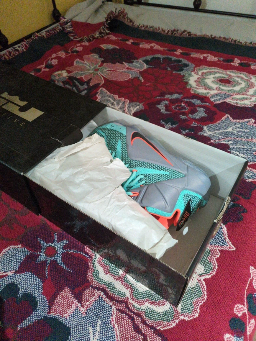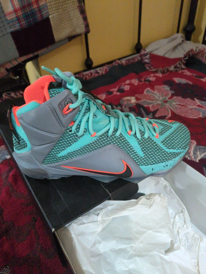 60Selling a pair of Nike LeBron XII basketball shoes in men's size 8.5. They are never worn and come with the original box. The colours are a mix of grey, teal, and orange. Great for playing ball or just rocking a cool pair of kicks!