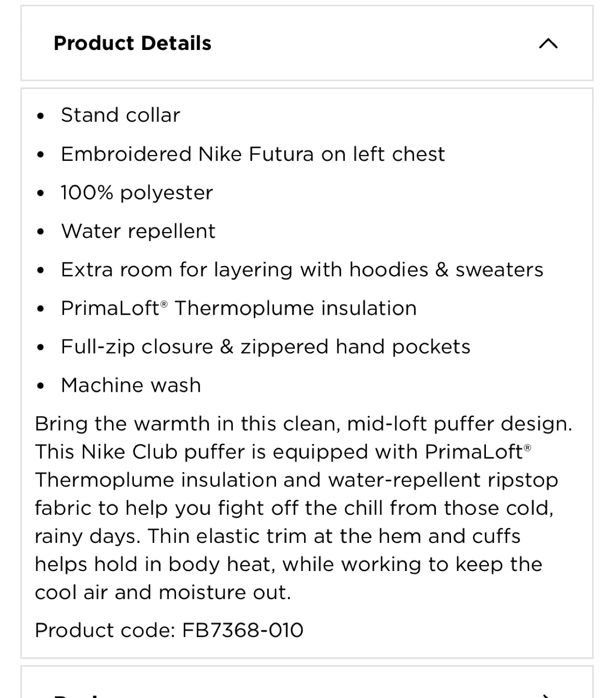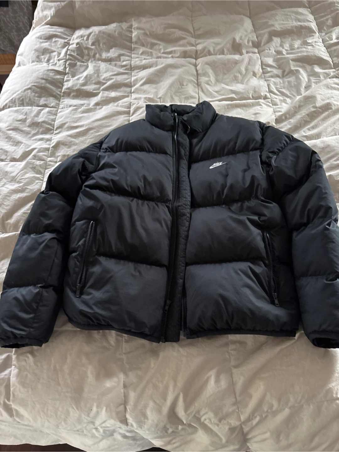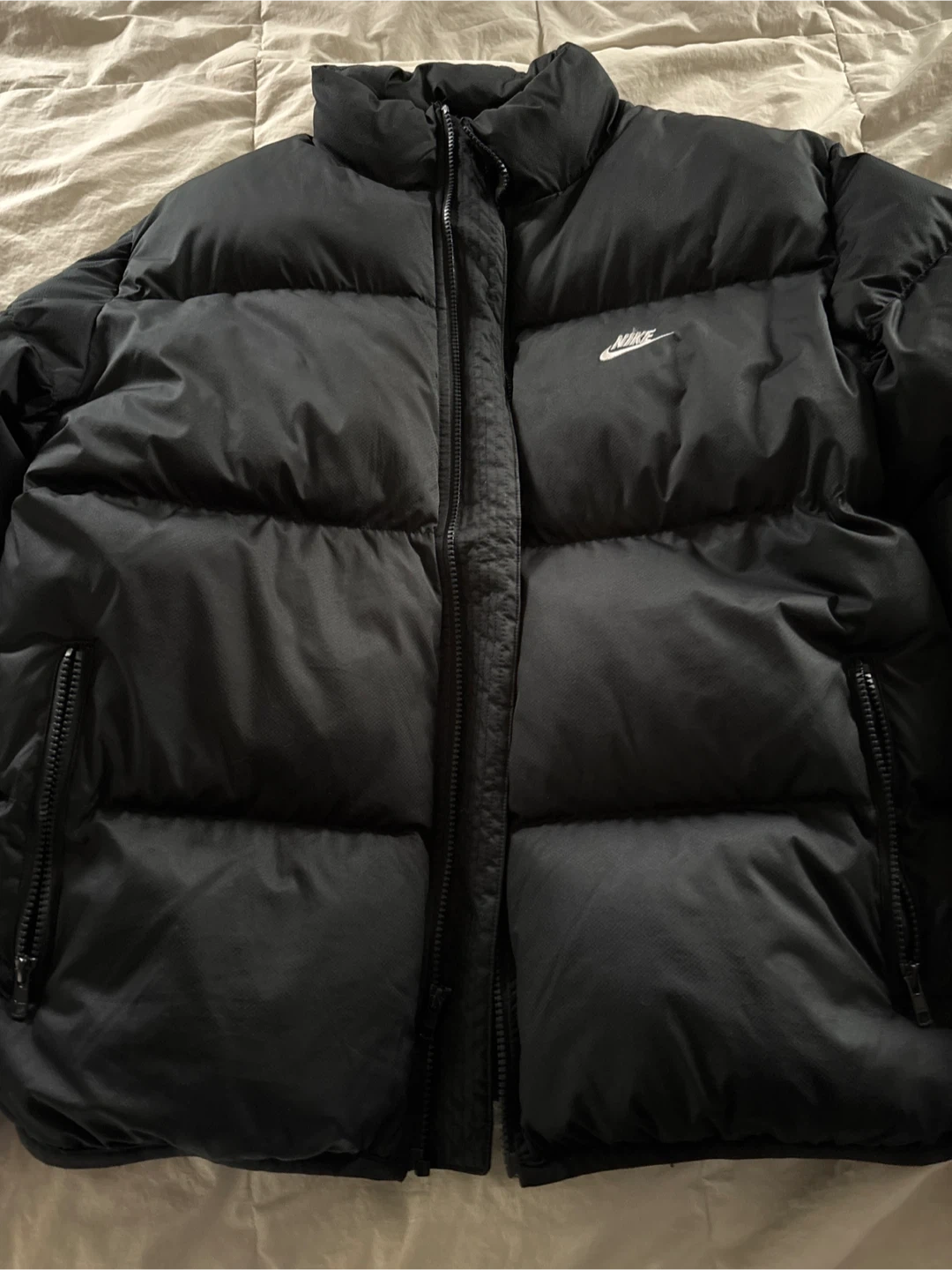 56LIKE NEW (worn couple times) paid $300 Selling a Nike Club puffer jacket in black. It's in great condition and ready to keep you warm this winter! Look cool while you stay SUPER WARM - Stand collar - Embroidered Nike Futura on left chest - 100% polyester - Water repellent - Extra room for layering with hoodies & sweaters - PrimaLoft® Thermoplume insulation - Full-zip closure & zippered hand pockets - Machine wash