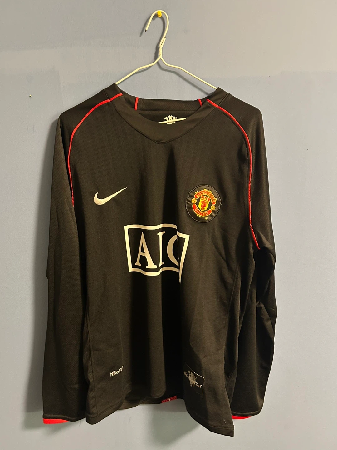 64Selling a Nike Manchester United long sleeve jersey with Ronaldo's name and number 7 on the back. The jersey is black with red accents and features the Manchester United logo. It's in great condition!