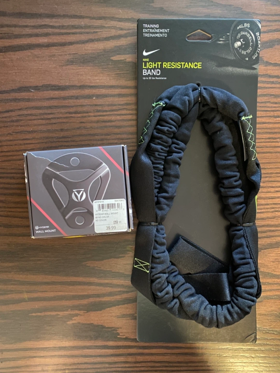 10Selling a Nike light resistance band, perfect for training! It provides up to 20 lbs of resistance. Also included is a Hygear wall mount. Originally priced at $39.99.