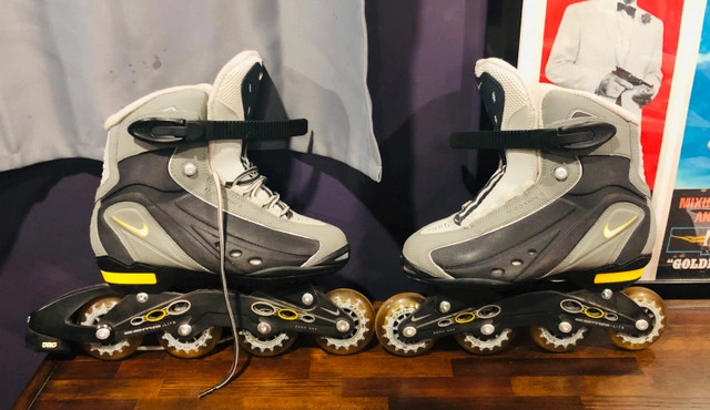 These are a pair of Nike rollerblades, a size US 8. They are in great condition, having only been used once. They have a grey and black colour scheme with yellow accents. * Size: US 8 * Colour: Grey/Black/Yellow If this ad is up, then yes, the rollerblades are still available!